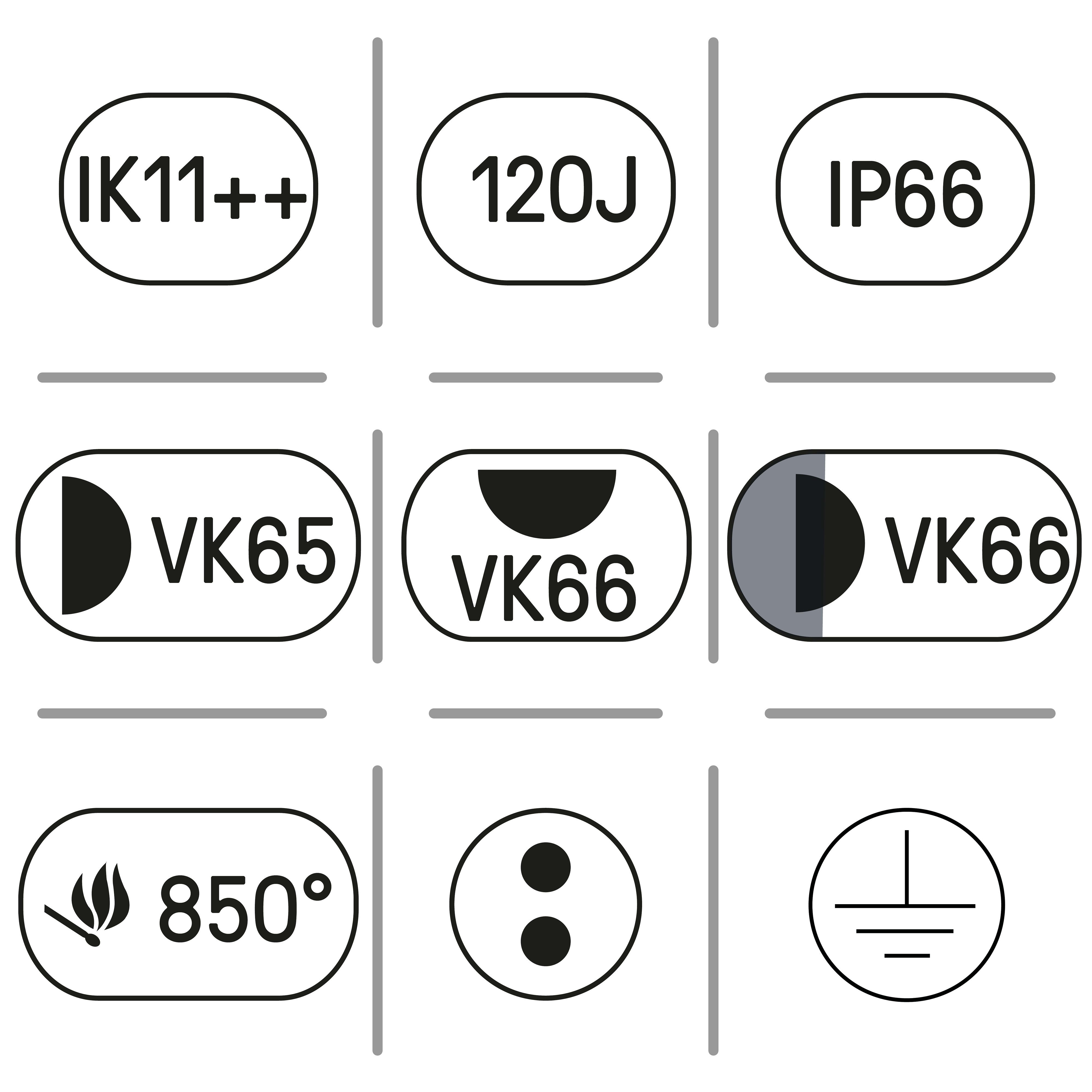 Hublot architectural très résistant à l'hypervandalisme IK11++ 120J, IP66Corps en fonte d'aluminium qualité marine, diffuseur polycarbonate opalescentØ 270x97 mmPose applique, encastré mural, plafonnierFermeture par vis inox antivandalesFabrication française certifiée Origine France Garantie