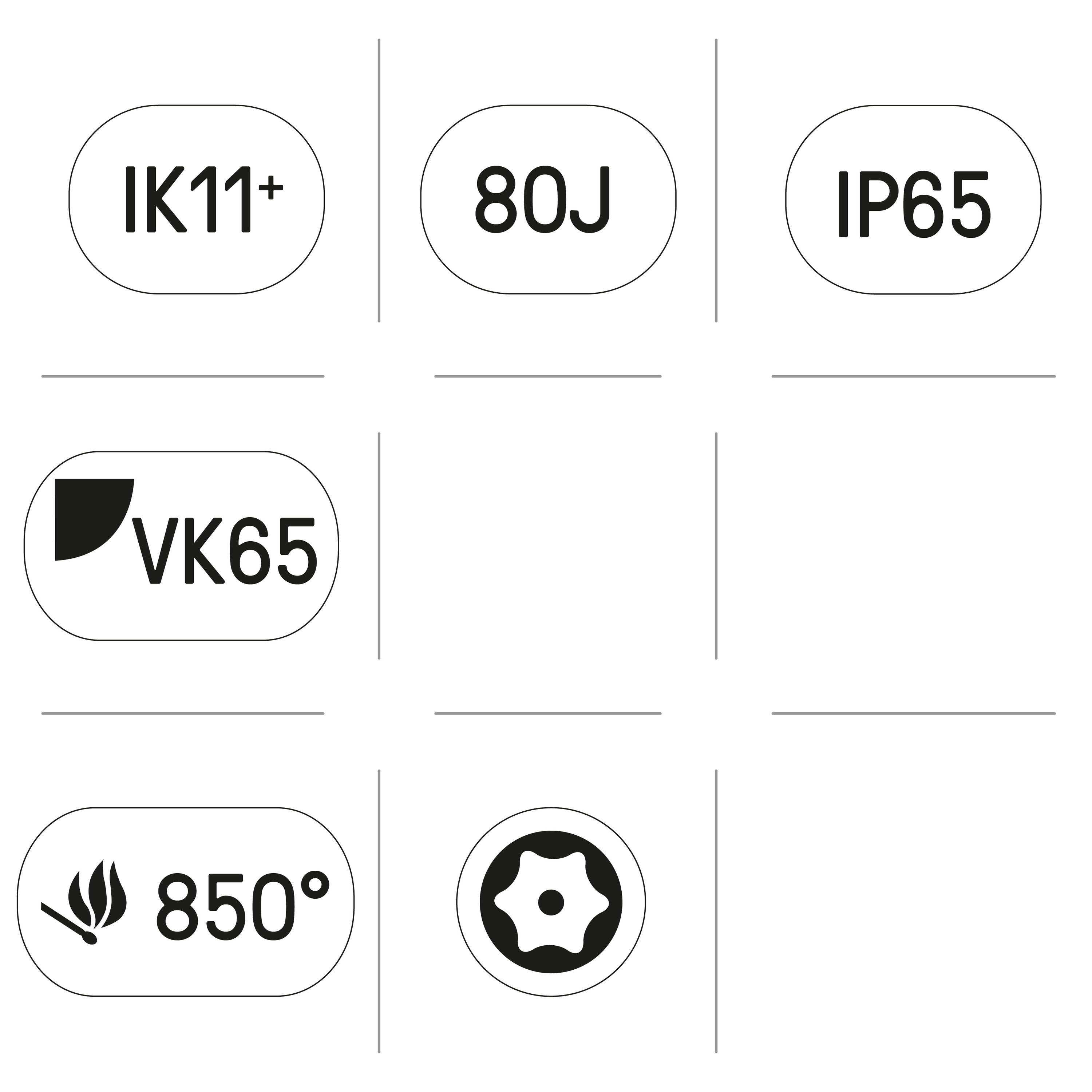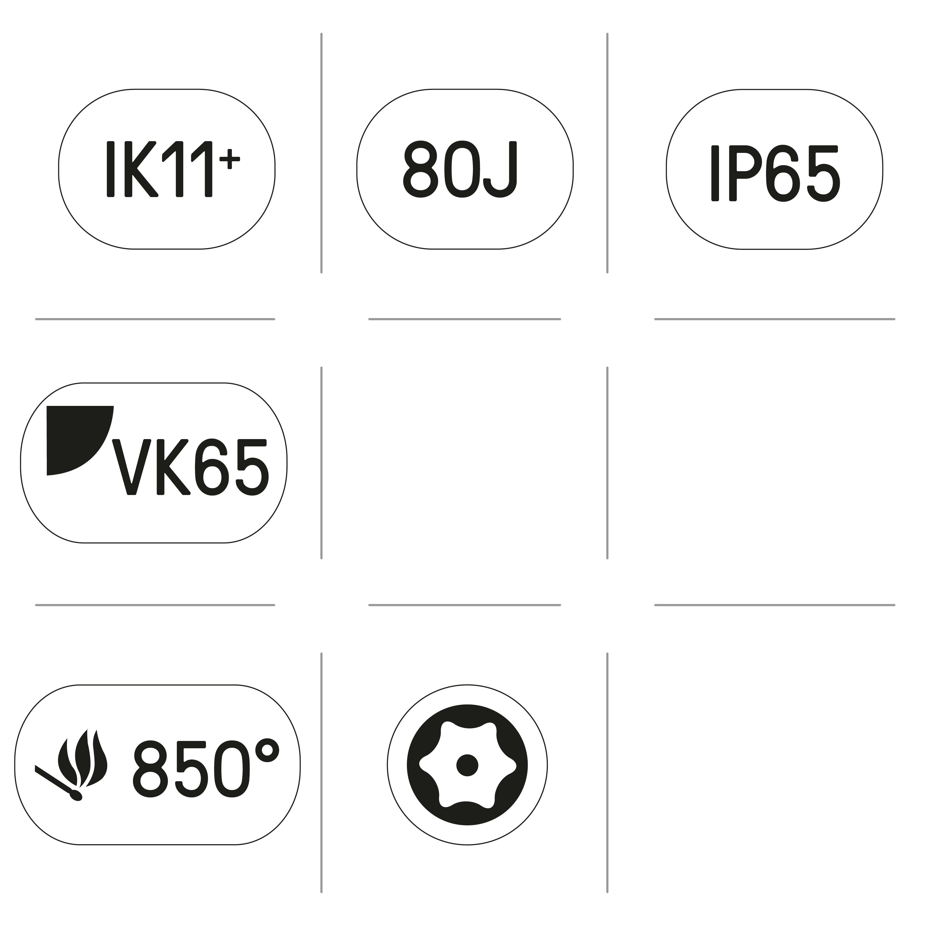 Son unité lumineuse en polycarbonate, résistante aux chocs, s’intègre dans un habillage à résistance renforcée IK11+ 80 joules, garantissant une grande robustesse.