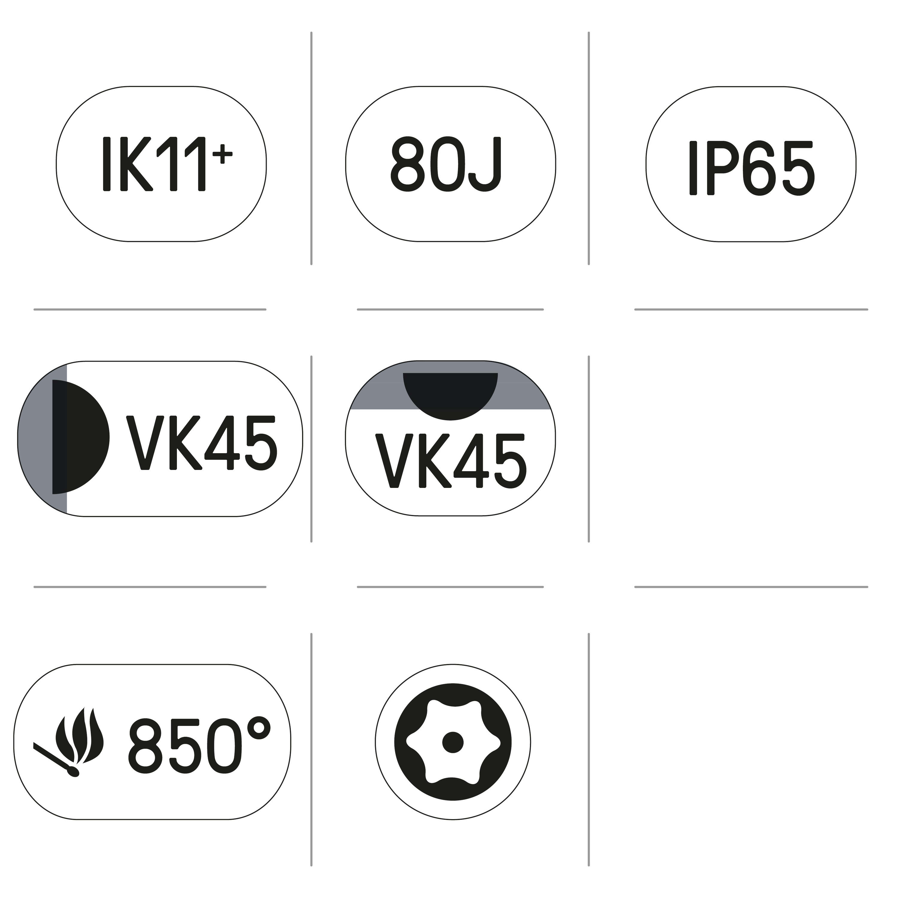 Son unité lumineuse en polycarbonate, résistante aux chocs, s’intègre dans un habillage à résistance renforcée IK11+ 80 joules, garantissant une grande robustesse.
