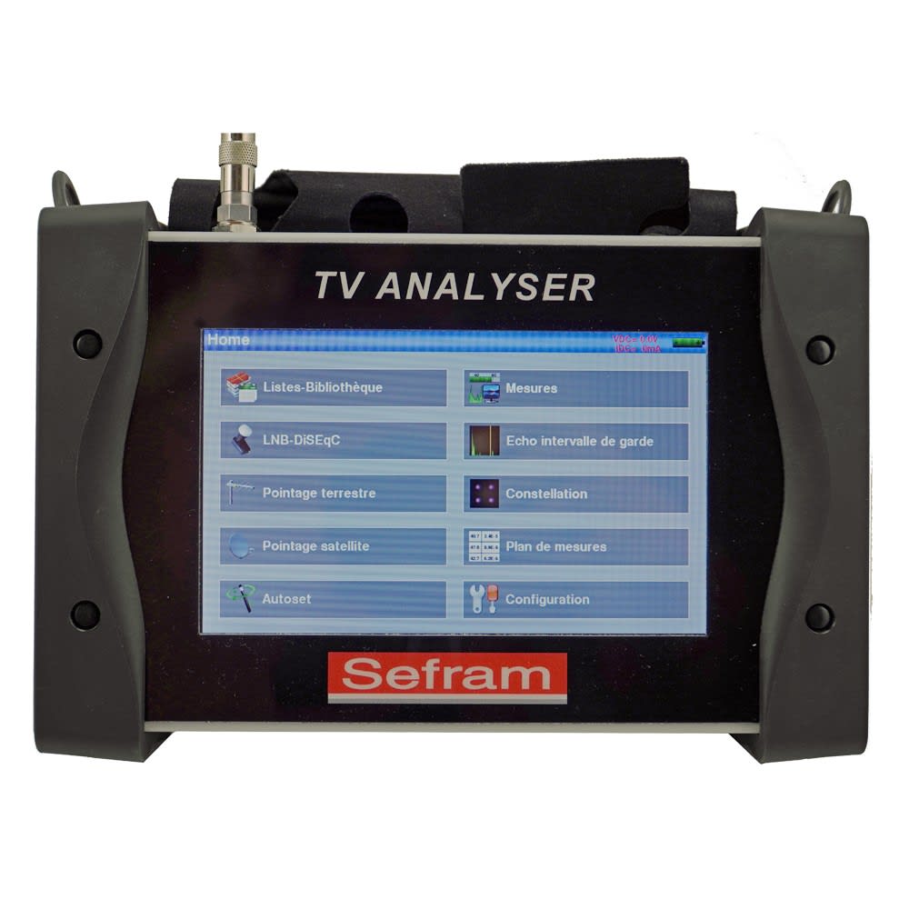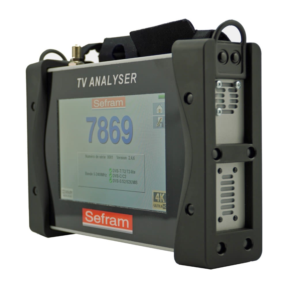Le SEFRAM 7869 est doté d'une interface homme-machine simple et conviviale qui vous permet de régler ou vérifier vos installations en un temps record.Un appareil tactile, robuste et compact :Avec son écran tactile 7 pouces haute définition, vous bénéficiez de tous les avantages d'un écran tactile : accès intuitif à toutes les mesures et aux différents menus. Le boitier très compact, avec ses coques latérales, assure une protection efficace contre les chocs. Le SEFRAM 7869 permet de réaliser toutes les mesures en DVB-T, DVB-T2/T2 Lite, DVB-C/C2, DVB-S/S2 et DVB-S2X (option) Il vous sera possible d’obtenir les mesures : BER, MER, paquets perdus, noise margin/link margin, ainsi que les mesures d'échos (DVB-T et DVB-T2).Le SEFRAM 7869 est doté d'un écran couleur 7 pouces de très haute qualité permettant l'affichage de toutes les mesures, mais aussi des programmes TV diffusés en clair, en MPEG-2, MPEG-4 et HEVC 4K.Le SEFRAM 7869 inclut un pointeur satellite avec identification du satellite ainsi qu’un pointeur terrestre, une fonctionnalité unique sur le marché bien pratique pour pointer une antenne TNT.Le SEFRAM 7869 dispose d'une interface USB permettant le transfert des données sur clef USB et la mise à jour du produit. Les mises à jour du programme interne sont gratuites durant toute la vie du produit.