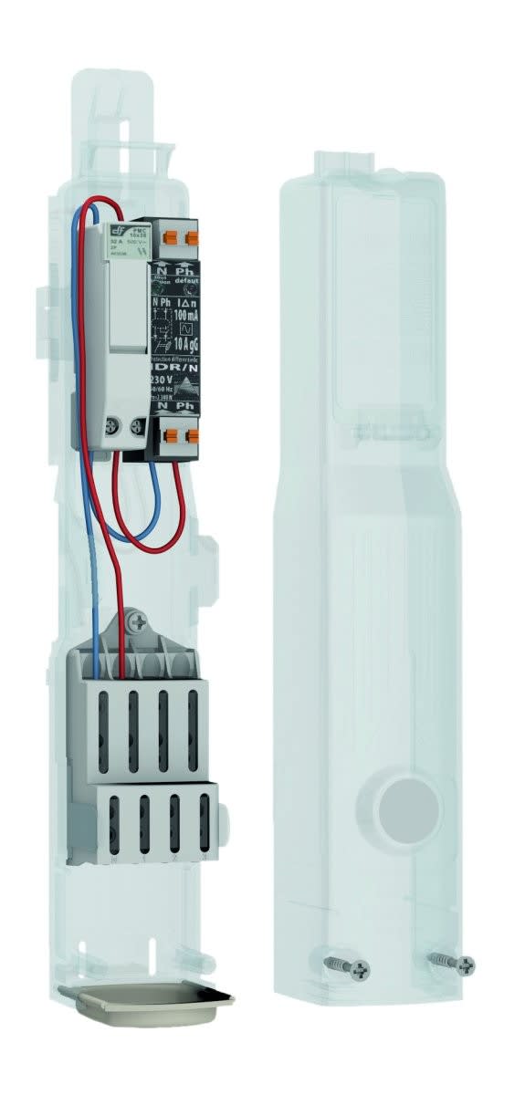 ECOFAST® - Boîtier de candélabre équipé d'un coupe-circuit 10x38 uni + neutre + un IDR/N 10A - 30 mA et d'un bornier monobloc à 2 étages 4x16 mm² + cartouche fusible 10A fournies - Réenclenchement suivant 3 tentatives (15 mn - 30 mn - 1h)