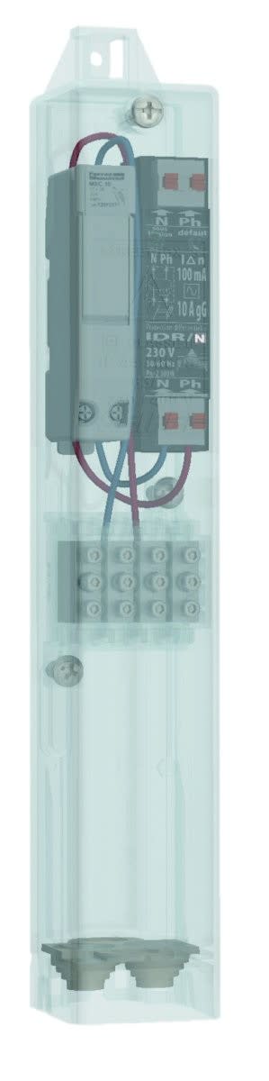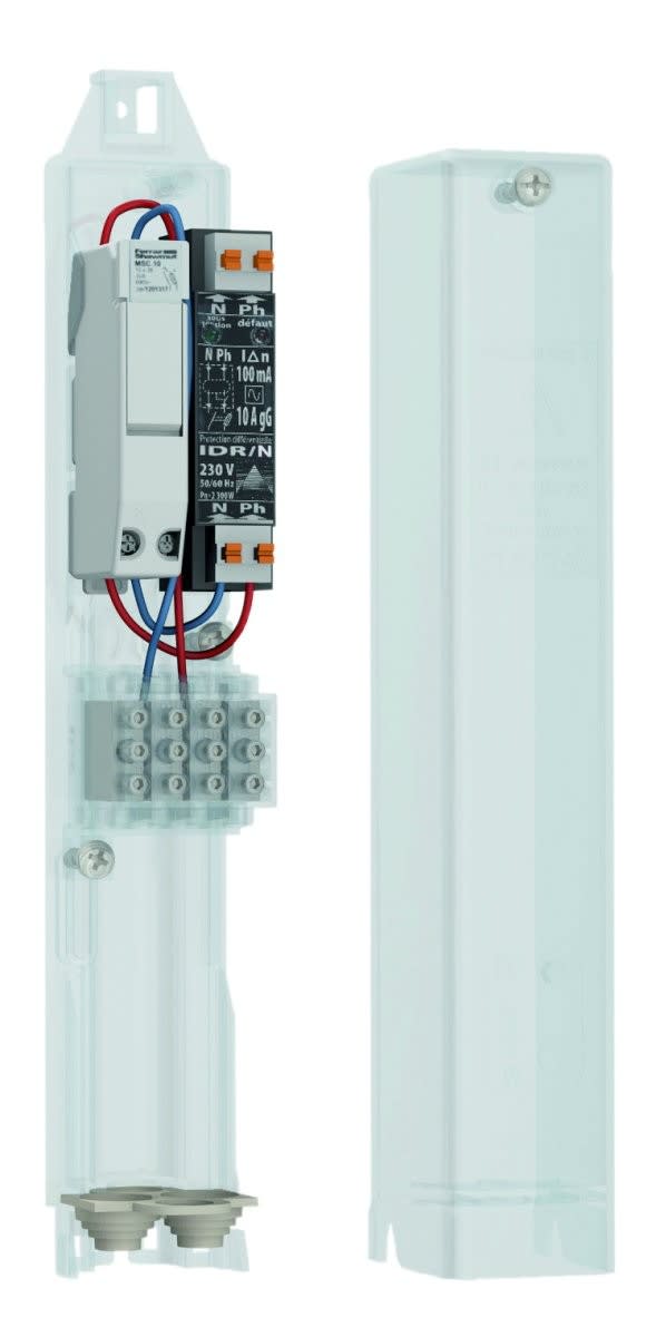 StreetBox S - Boîtier de candélabre équipé d'un coupe-circuit 10x38 uni + neutre + IDR 10A - 30 mA et d'un bornier monobloc à 2 étages 4x10 mm² avec cache - Réenclenchement suivant 3 tentatives (15 mn - 30 mn - 1h)