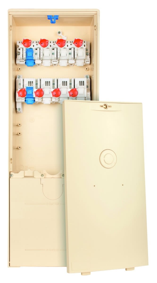 Borne ECP2D avec embase téléreportCoupure 400A ou protection 200A par barrettes ou fusibles Taille 22 directionsSerrure TriangleColoris IvoireSigle Eclair