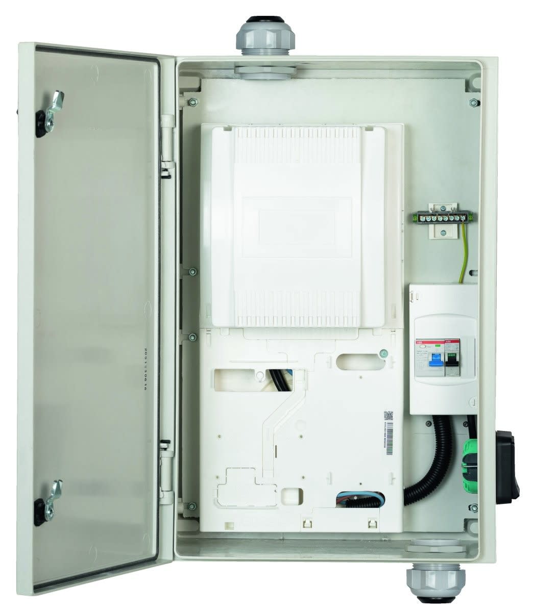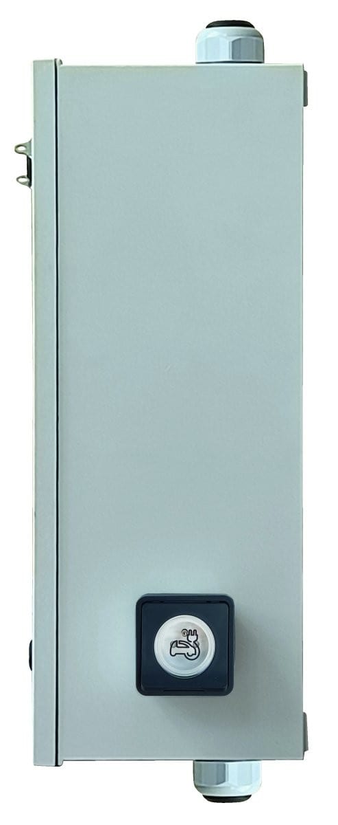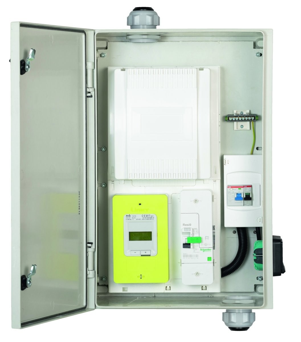 Coffret ARED 64 pour comptage IRVE équipé d'un panneau monophasé (CBE ou Linky) avec CCPI Type B et prise renforcée 3,7 kVA