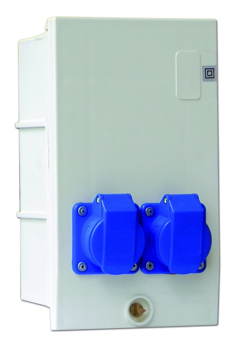 Coffret S50 EP équipé de : bornier double triphasé + neutre + Terre 2x5x25 mm² + 2 PC + 2 disjoncteurs monophasés 10A-30 mA - H270-L154-P106