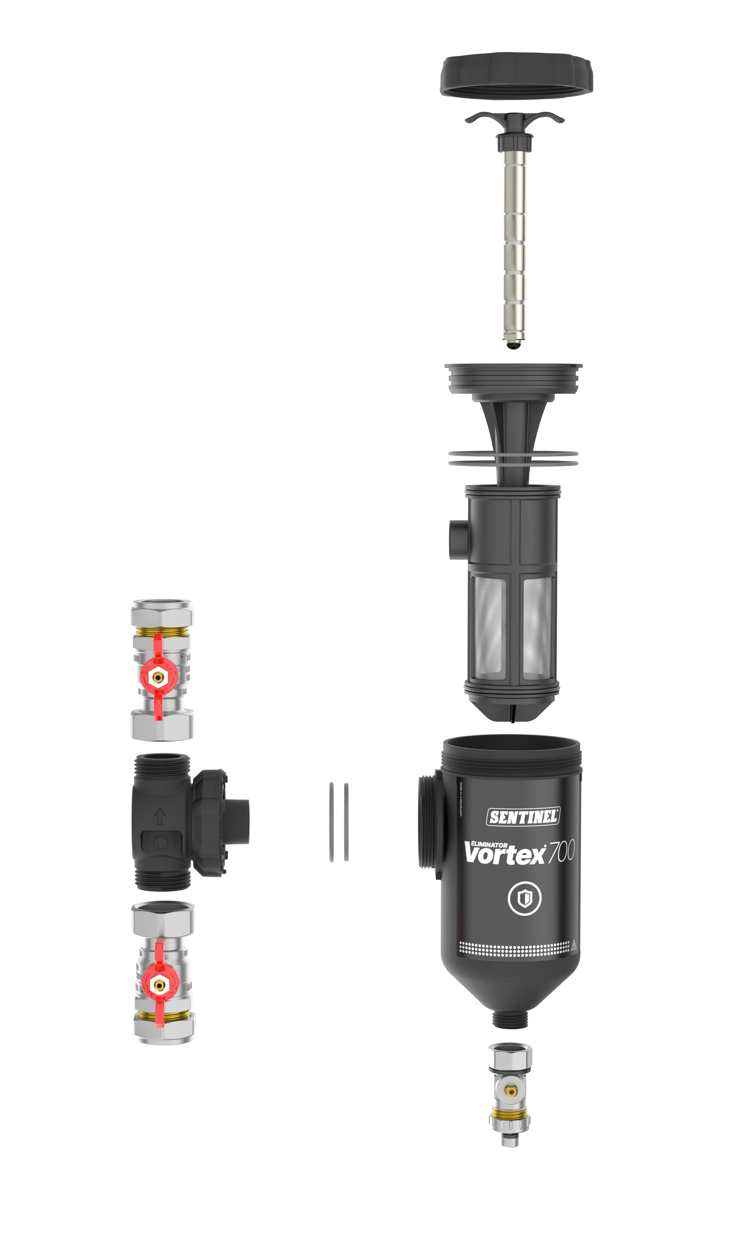 Sentinel Performance Solutions - VORTEX 700 Filtre magnétique PAC tamis 800 microns, Té orientable, vannes 28mm - ELIMV700-GRP28-EXP