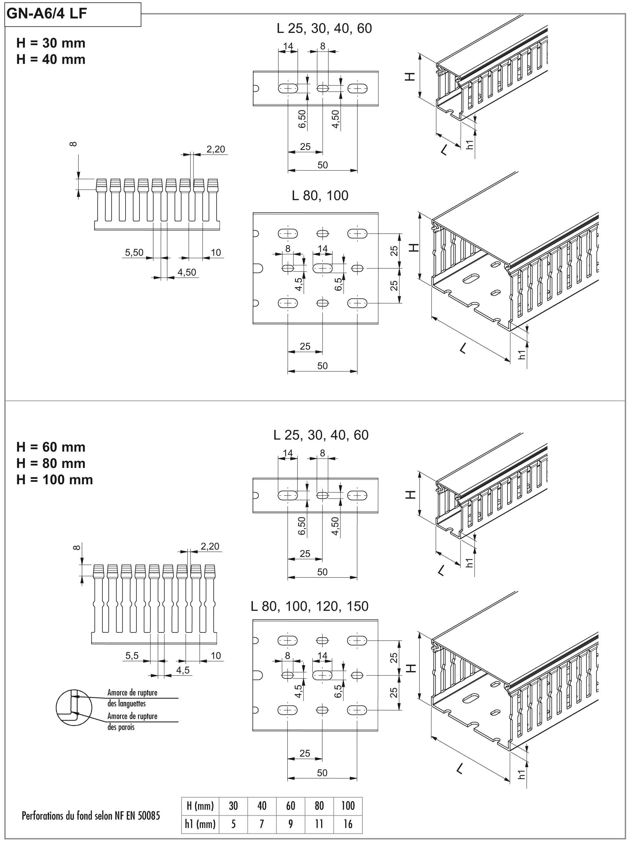 goulotte avec fentes latérales pour permettre le passage des fils et perforations du fond pour fixation