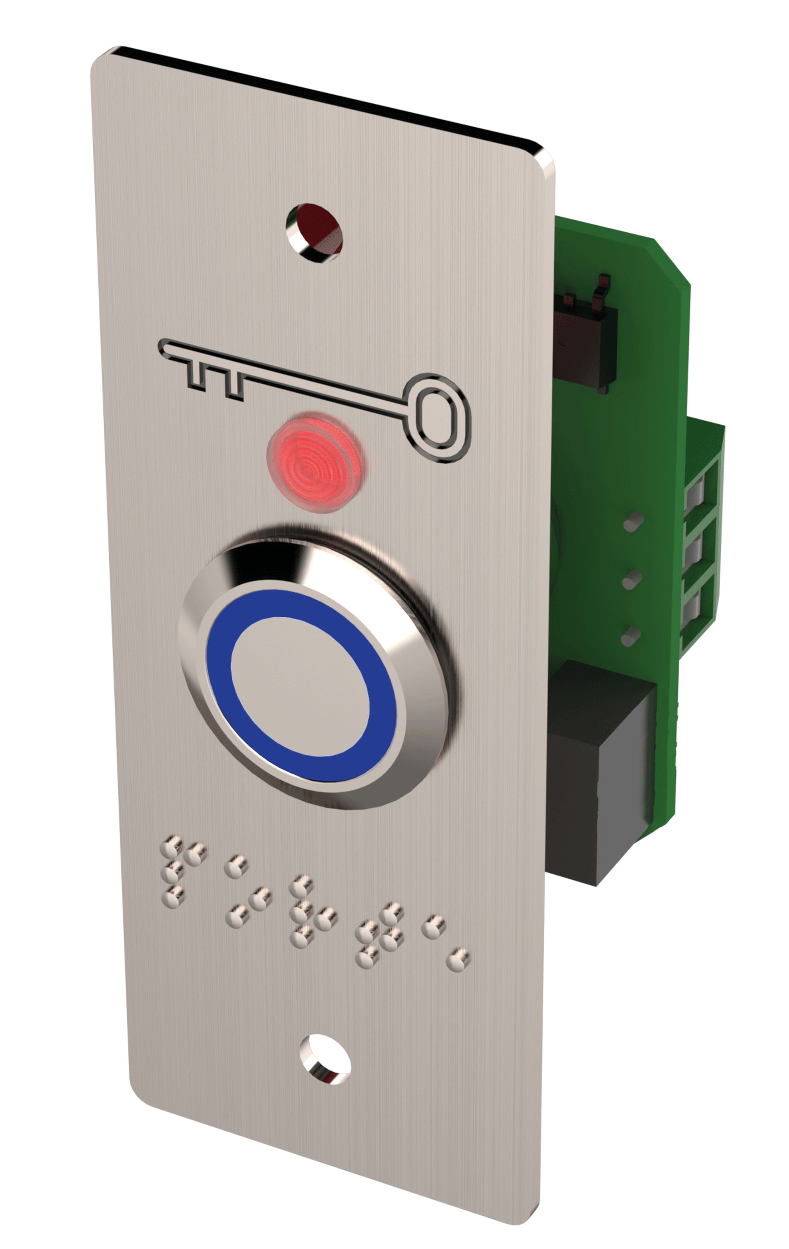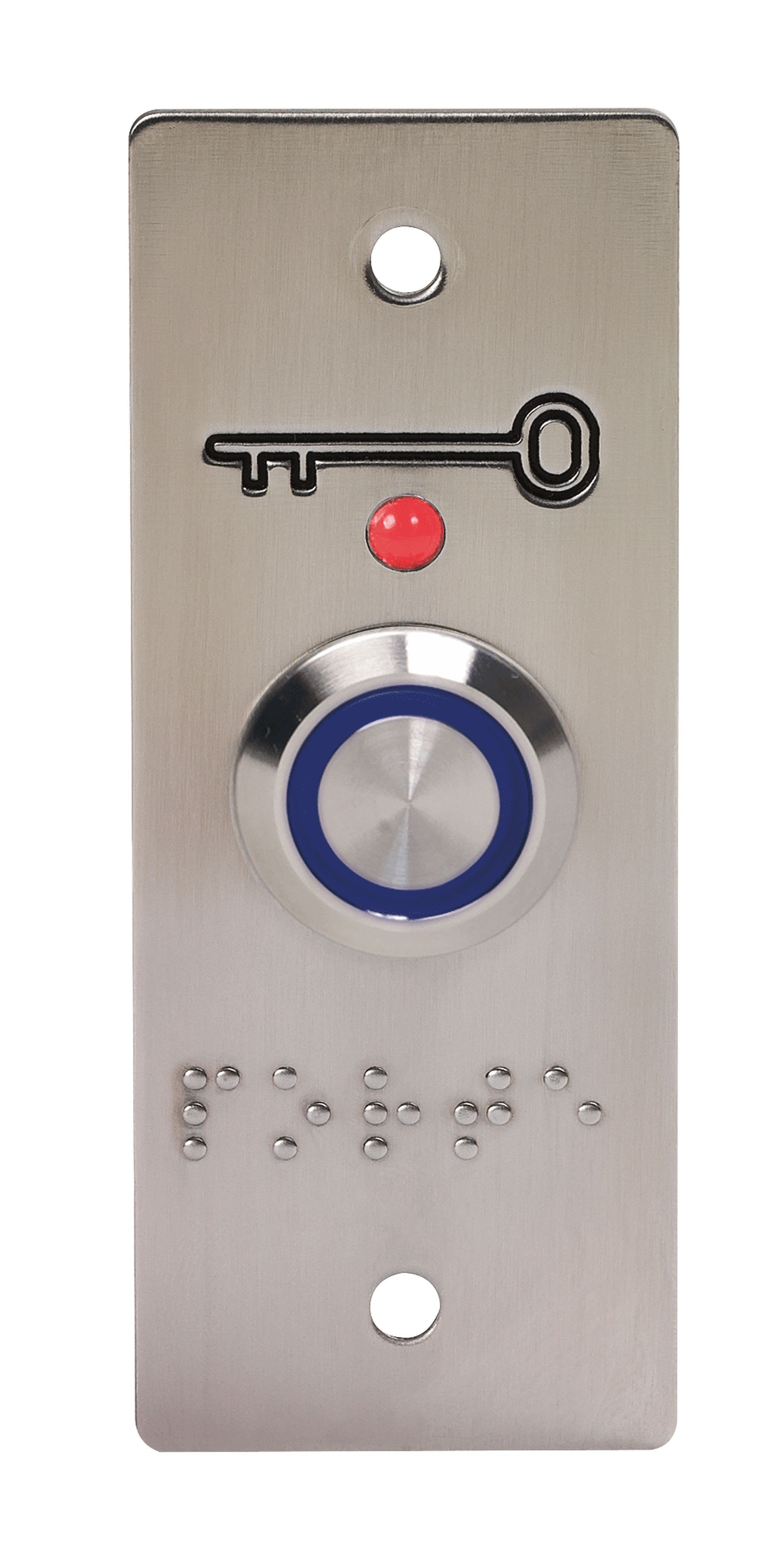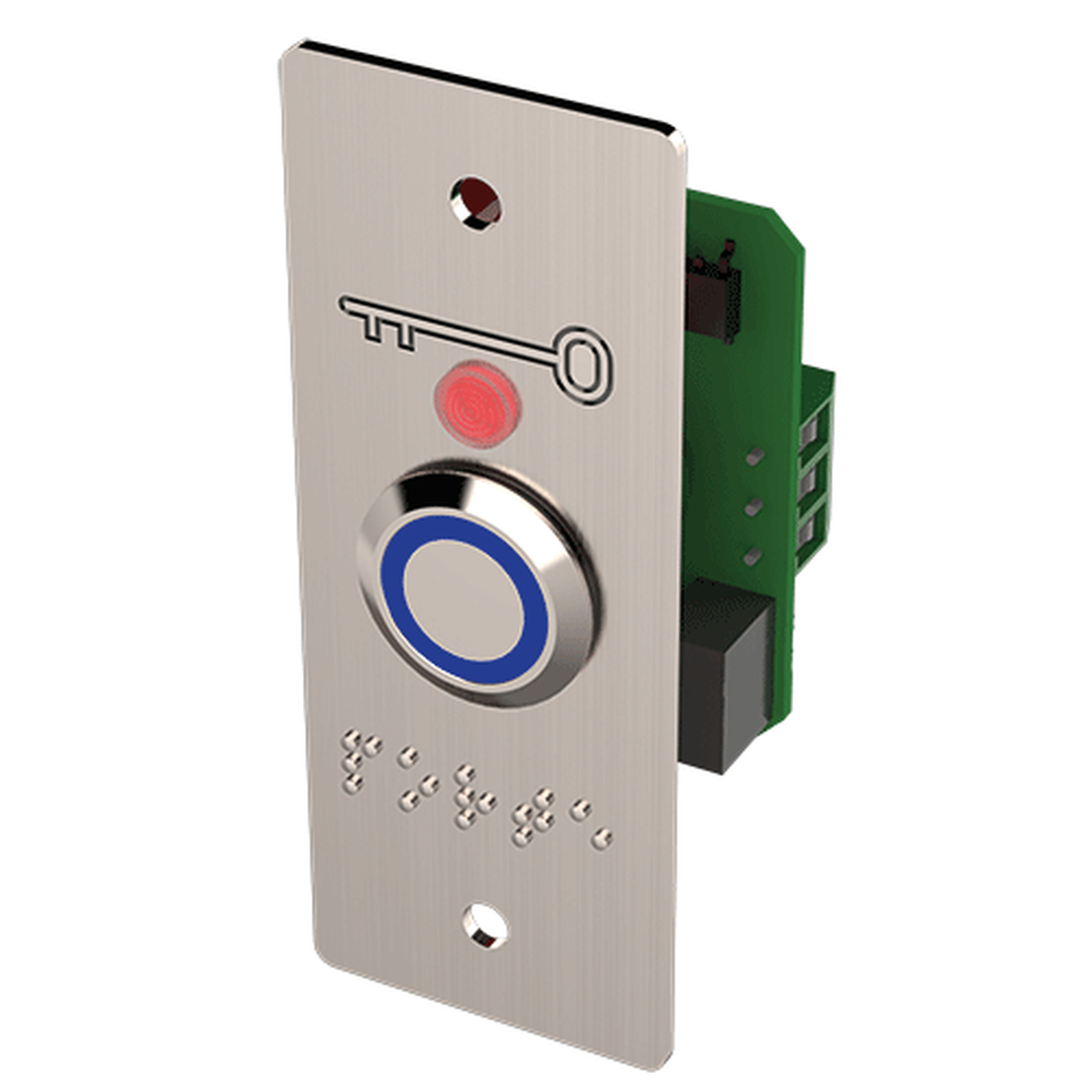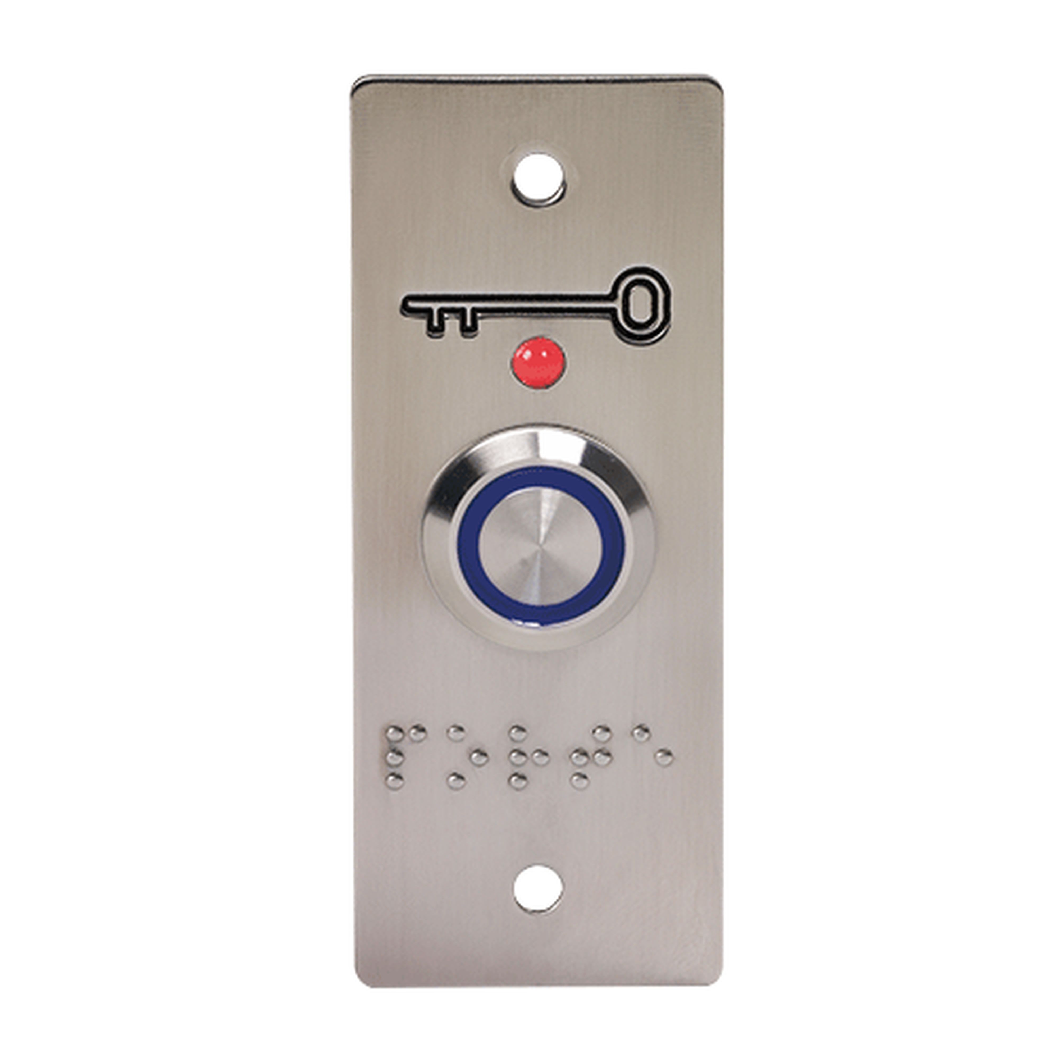 Bouton poussoir lumineux bleu avec plaque d'encastrement étroite braille, buzzer led, tempo, bornier