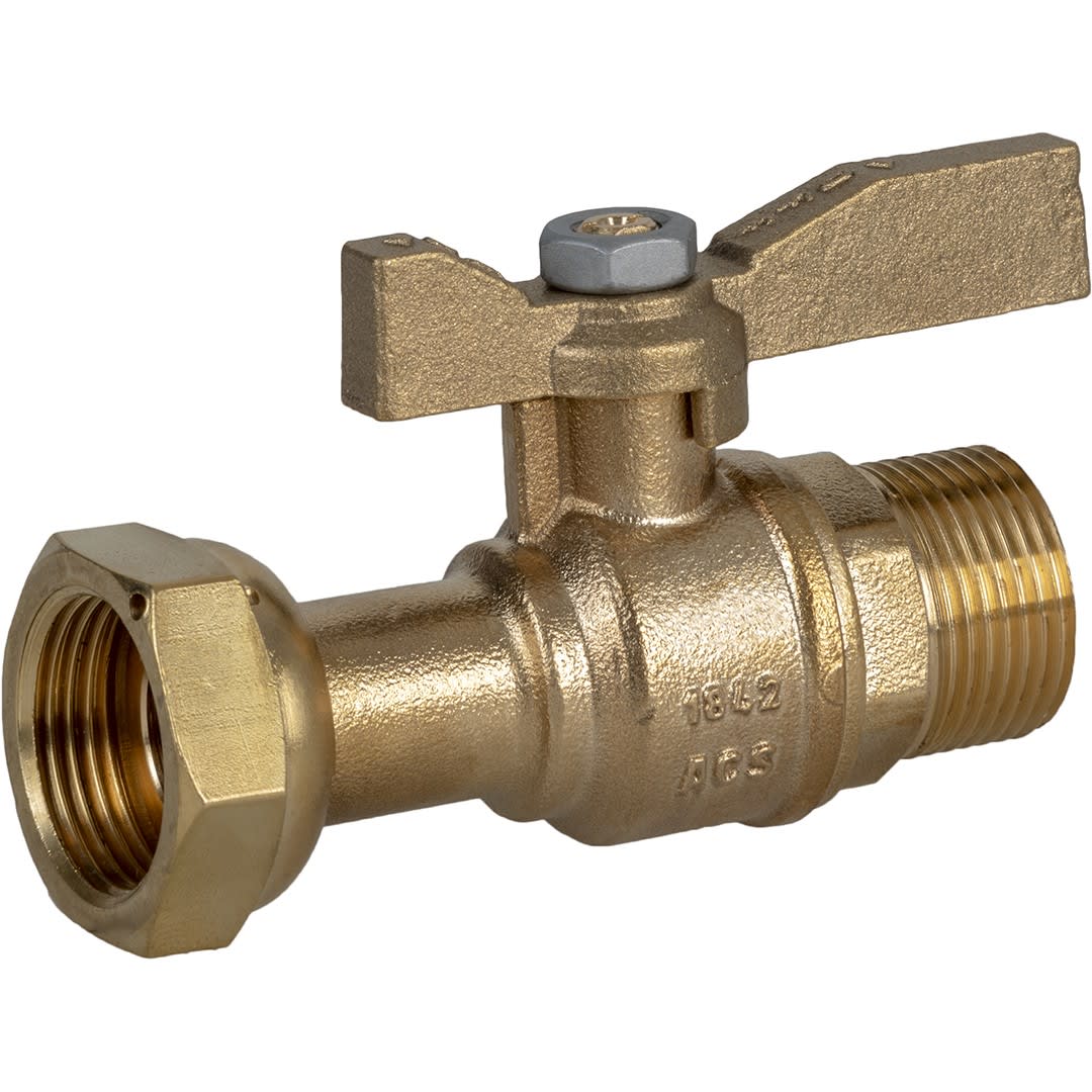 Robinet de compteur droit NF DN15 Mâle DN1/2" - Ecrou tournant DN3/4" avec manette papillon verte 2/3-1/3 - Double étanchéité à l'axe avec joint EPDM et presse étoupe PTFE - Garantie 10 ans - ACS - Corps laiton sans plomb CW510L-4MS