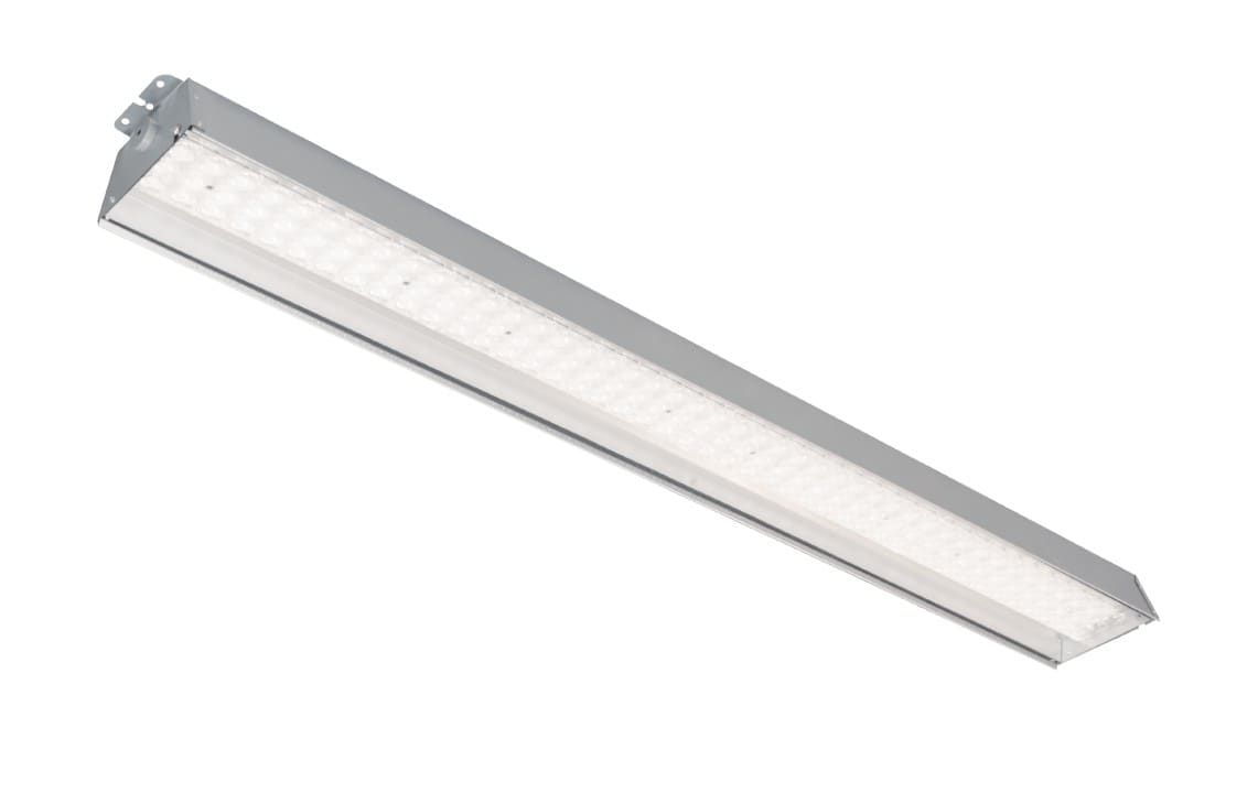 Arena Eco 1200 Wide luminaire à usage industriel LED 47W 3000K 6710 lumens 143 lumens/W IRC>80 non dimmable SDCM 3 UGR<25 durée de vie : L80/B20>100 000 heures faisceau 90° Matériau : acier et PMMA classe I IP23 IK10