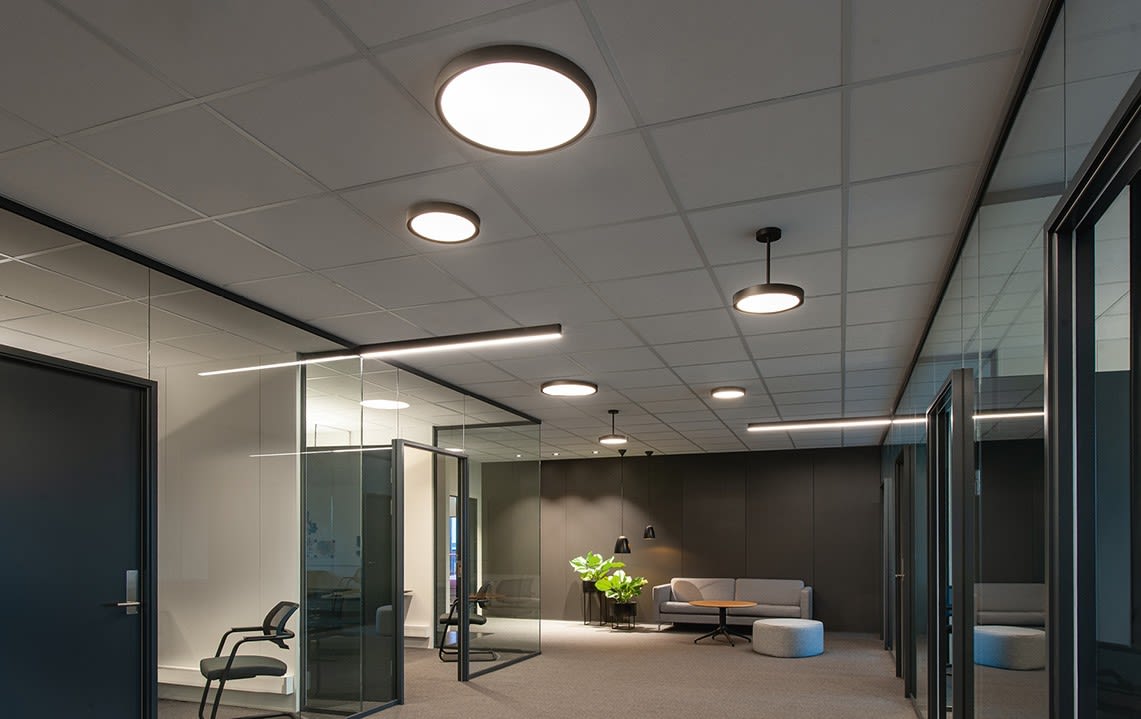 Disc 480 luminaire en saillie au profil effilé blanc LED 36W 3000K 3560 lumens 99 lumens/W Connect (via Zigbee) IRC >80 SDCM 3 durée de vie : L80/B20>100 000 heures UGR <22 aluminium et prisme opale 230V classe II IP20 IK10