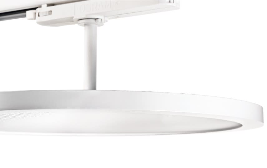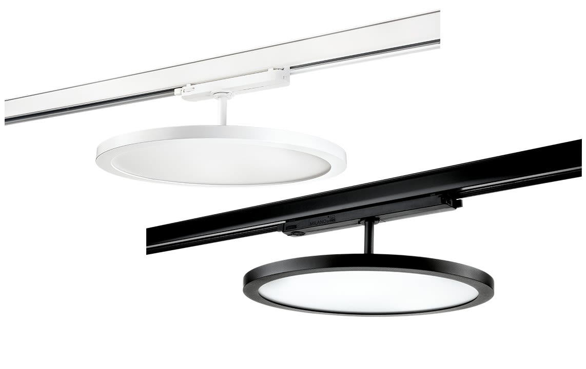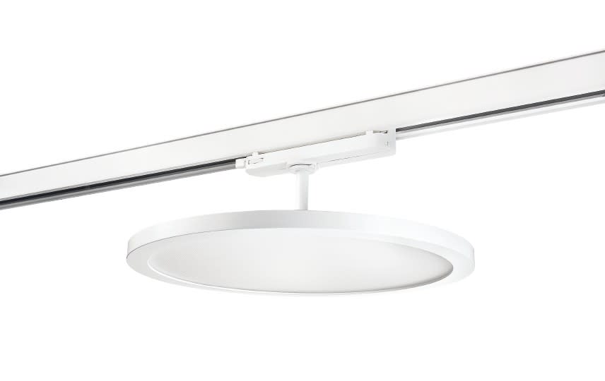 Sense 320 dalle ronde pour rail 3 allumages Shopline blanc LED 27W 3570 lumens 132 lumens /W 4000K non dimmable faisceau de 85° IRC >80 RG 0 SDCM 3 durée de vie : L80/B20>100 000 heures matériau : aluminium et PMMA classe II IP20/IP40
