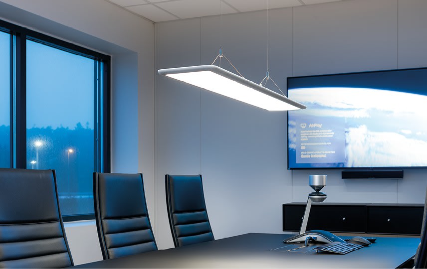 Gamme complète de luminaires LED ronds, carrés, différentes tailles, encastrés et suspendus