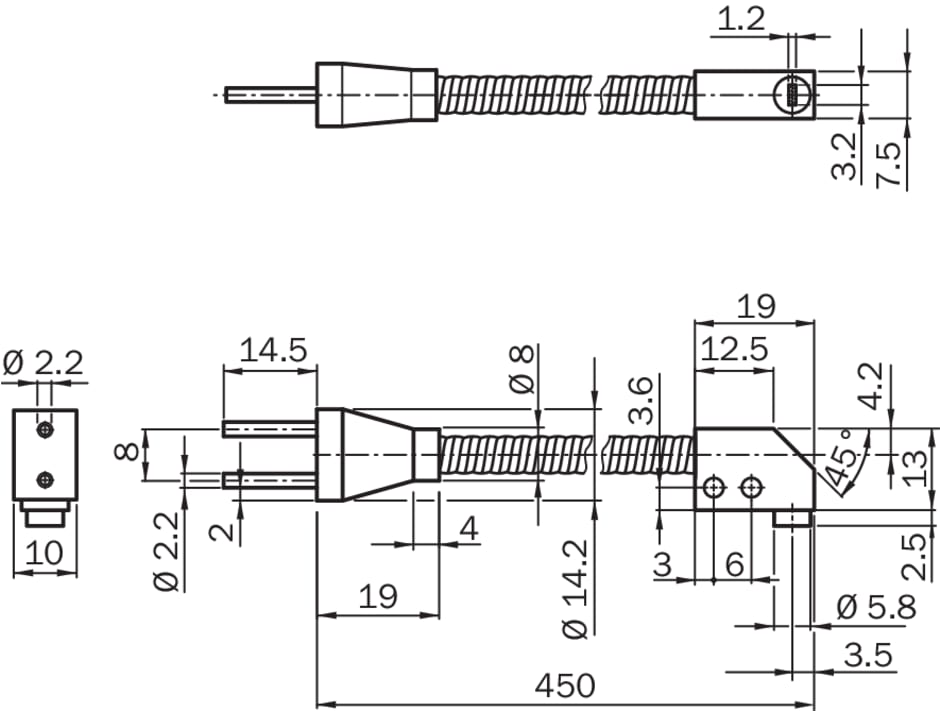 Amplificateurs à fibres optiques, Câbles à fibres optiques, LL3-LM37450, Principe de fonctionnement: Système de détection, Forme tête de fibres optiques : Forme plate, déflecteur 90°, Longueur du câble à fibres optiques: 450 mm, Matériau, fibre: Verre, Matériau, gaine: Plastique, Matériau, tête de fibre optique: Aluminium