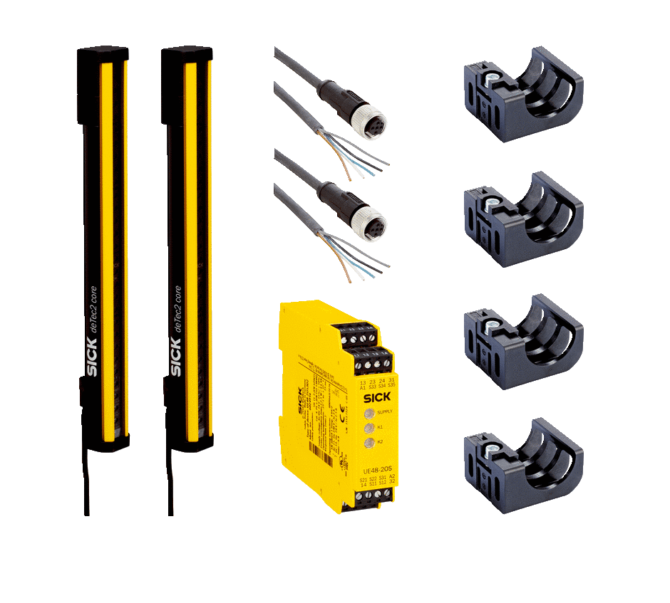 Barrages immatériels de sécurité, deTec, deTec2 Core Set 30/1050, Version du produit: deTec2 Core, Pièce du système: Set, Domaine d'utilisation: Environnement industriel standard, Niveau de sécurité: PL c, SIL 1, type 2, Résolution: 30 mm, Portée: 15 m, Hauteur du champ de protection: 1.050 mm, Mode de raccordement: Fiche M12, 5 pôles, Indice de protection: IP65IP67, Contenu de la livraison: ÉmetteurRécepteur4 supports FlexFix4 fixations QuickFix2 câbles de raccordement, 5 mBâton test dont le diamètre correspond à la résolution du barrage immatériel de sécuritéRelais de sécurité RLY3-OSSD2Consigne de sécuritéNotice de montageNotice d’instruction à télécharger