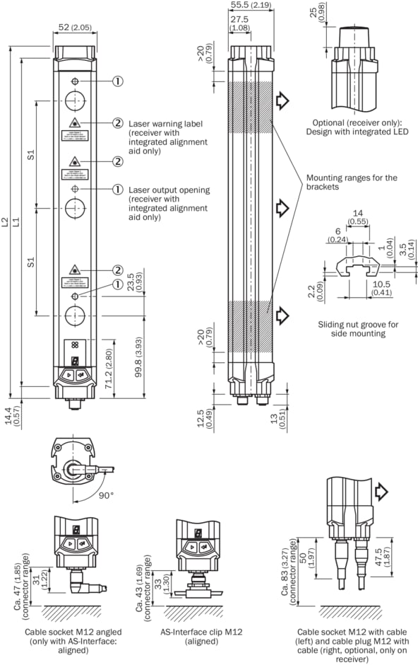 Barrières photoélectriques de sécurité, M4000 Standard, M40E-025030RT0, Pièce du système: Récepteur, Portée: 70 m, Nombre de faisceaux: 2, Entraxe des faisceaux: 500 mm, Mode de raccordement: Connecteur mâle M12, 8 pôles, Raccordement supplémentaire Réarmement: Connecteur femelle M12, 5 pôles, Outil d'alignement laser intégré: oui, Embout à LED de visualisation intégrée: oui