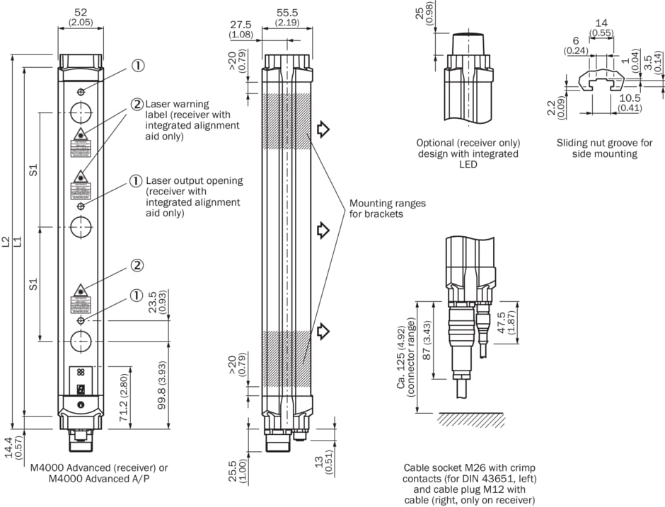 Barrières photoélectriques de sécurité, M4000 Advanced A/P, M40Z-043003TB0, Pièce du système: Unité active, Portée: 4,5 m, Nombre de faisceaux: 4, Entraxe des faisceaux: 300 mm, Mode de raccordement: Connecteur mâle Hirschmann M26, 12 pôles, Connecteur d'extension: Connecteur femelle M12, 5 pôles, Embout à LED de visualisation intégrée: non