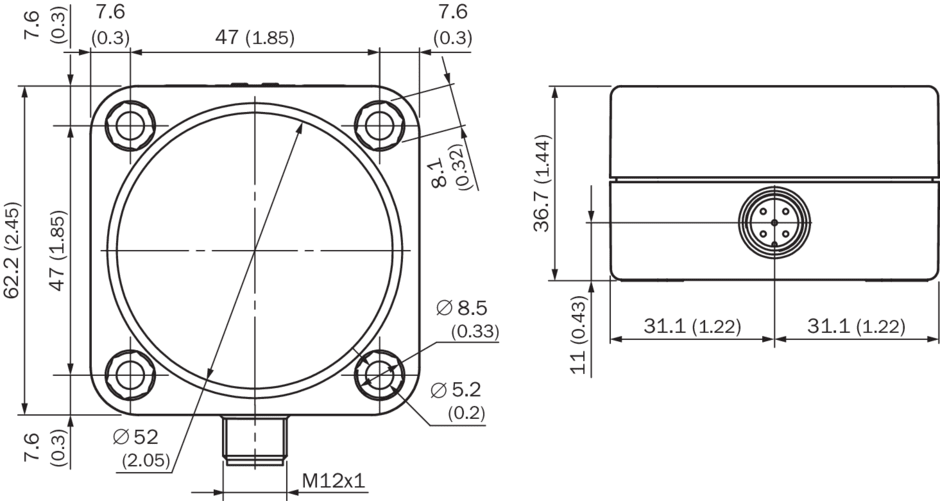 Capteurs de distance à ultrasons, UC30, UC30-215164, Interface de communication: -, Portée de travail, portée limite: 600 mm ... 6.000 mm, 8.000 mm, Mode de raccordement: Connecteur mâle, M12, 5 pôles, Sortie d'émission: Droit, Temps de réponse: 240 ms, Sortie numérique: 2 x NPN