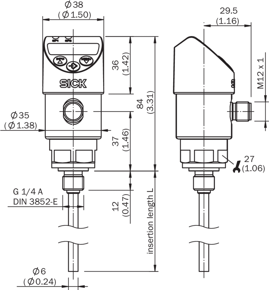 capteurs de température, TBS, TBS-1ASGT2506NM, Plage de mesure température: –20 °C ... +80 °C, Précision de l'élément de mesure: ≤ ± (0,15 °C + 0,002 |t|), classe A selon CEI 60751, Temps de réponse: t50 t90, Raccord process: Filetage G ½ A, Longueur d'insertion/diamètre de la sonde: 250 mm / 6 mm, Joint: NBR, Signal de sortie: 2 x PNP, Mode de raccordement: Connecteur mâle cylindrique M12 x 1, 4 pôles, Indice de protection: IP65, IP67