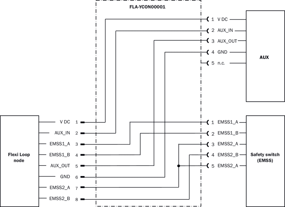 cascade de capteurs sûre, Flexi Loop, FLA-YCON00001, Composants de Flexi Loop: Adaptateur en Y, Description: L'adaptateur Flexi Loop Y (EMSS) divise le raccordement 8 pôles du FLN-EMSS1100108 en deux raccordements 5 pôles : un pour les interrupteurs de sécurité électromécaniques équivalents double canal et un pour les signaux d'entrée et de sortie non sécurisées.
