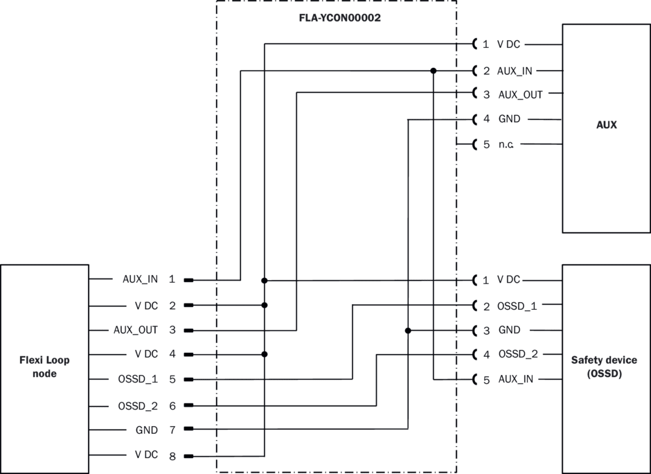 cascade de capteurs sûre, Flexi Loop, FLA-YCON00002, Composants de Flexi Loop: Adaptateur en Y, Description: L'adaptateur Flexi Loop Y (OSSD) divise le raccordement 8 pôles du FLN-OSSD1100108 en deux raccordements 5 pôles : un pour les capteurs de sécurité avec sorties OSSD double canal et un pour les signaux d'entrée et de sortie non sécurisées.