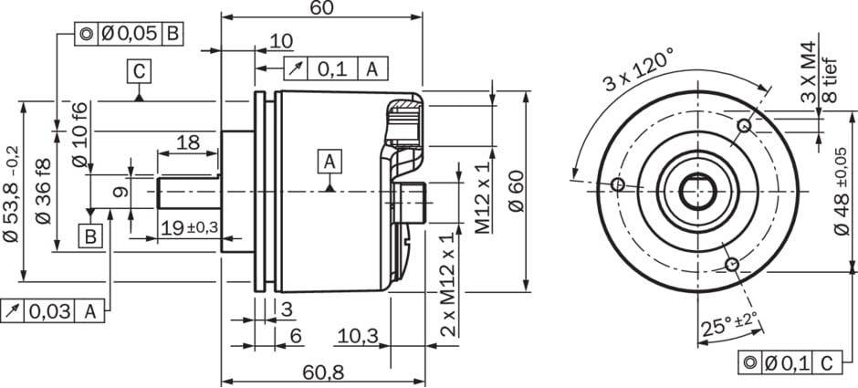 codeurs absolus, A3M60, A3M60B-S4PB013x13, Version monotour ou multitours: Multitours, Résolution max.: 13 bit x 13 bit (8.192 x 8.192), Interface mécanique: Arbre plein bride de serrage 10 mm x 19 mm (avec surface), Interface de communication: PROFIBUS DP, DPV0, programmable, Mode de raccordement: Connecteur mâle, 2x, M12, 5 pôles, axial, Connecteur femelle, 1x, M12, 5 pôles, axial, Interface de programmation: Via l’outil d’ingénierie API