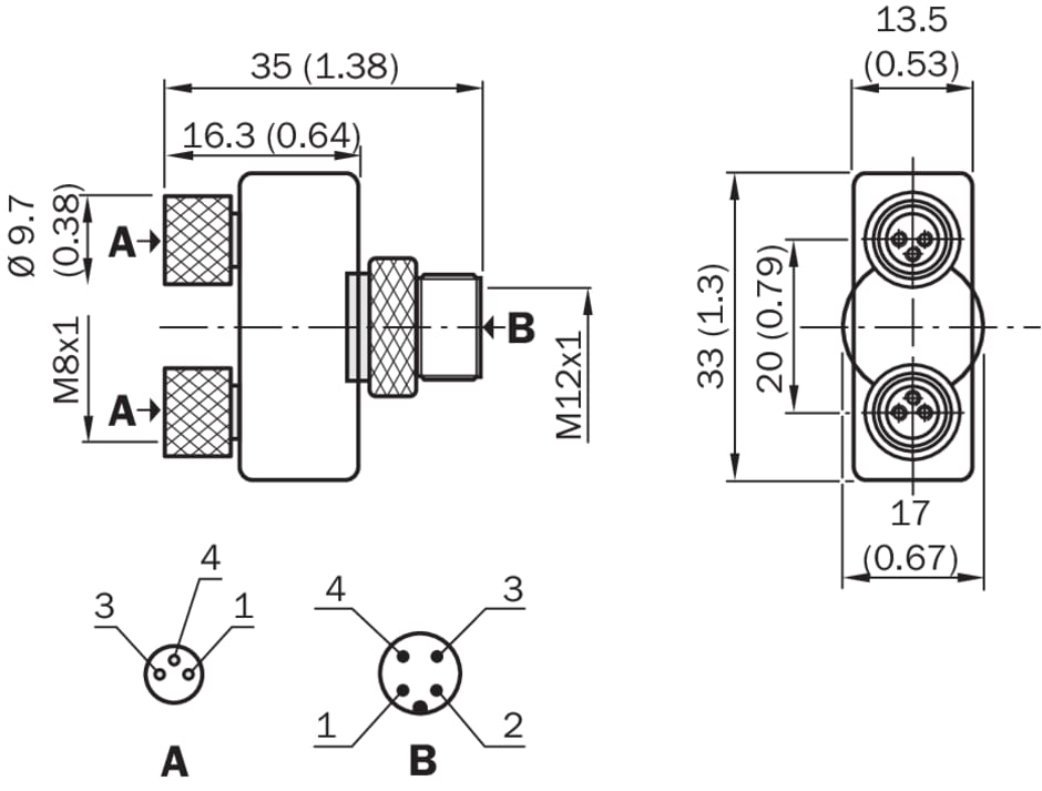 connecteurs et câbles, Pièces en Y et en T, SBO-02C08-SF, Mode de raccordement tête A: Connecteur mâle, M12, 4 pôles, Codage A, Mode de raccordement tête B: Connecteur femelle, M8, 3 pôles, Codage A, Mode de raccordement tête C: Connecteur femelle, M8, 3 pôles, Codage A, Description: Non blindé