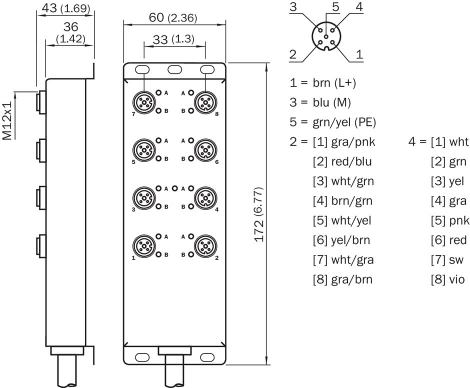 connecteurs et câbles, boîtes de jonction passives, SNL–08D12–KA10, Nombre d'emplacements: 8, Type de raccordement emplacements: M12, 5 pôles, Codage A, Connecteur femelle, Contenu de la livraison: Avec 4 capuchons et 10 étiquettes, Câble: