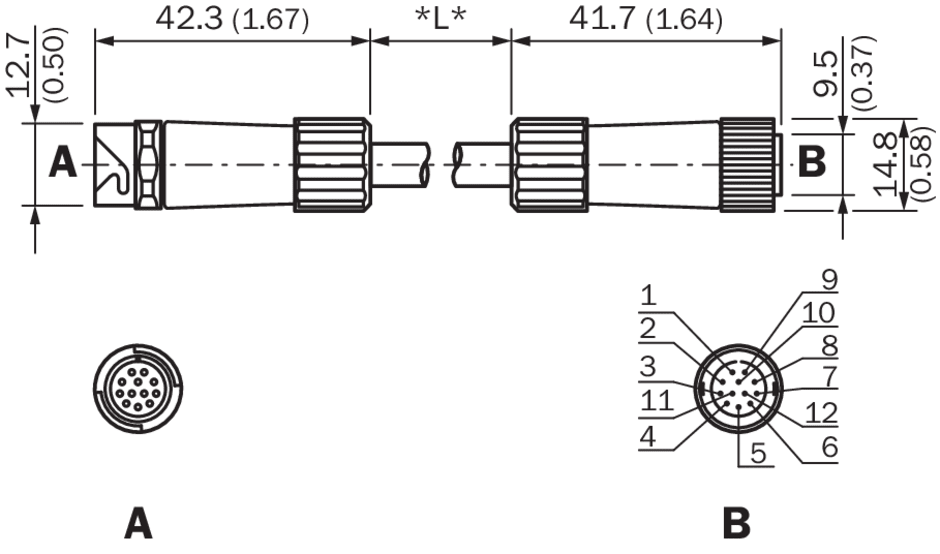 connecteurs et câbles, autres connecteurs mâles et câbles, YFHRSB-100XXXMHRSB, Mode de raccordement tête A: Connecteur femelle, M12, 12 pôles, droit, Mode de raccordement tête B: Connecteur mâle, M12, 12 pôles, droit, Type de signal: RS-422