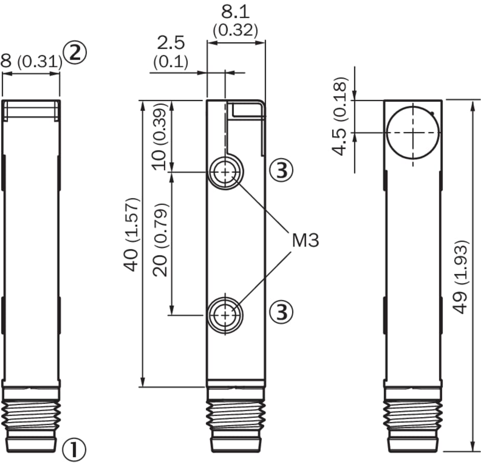 détecteurs de proximité inductifs, IQY, IQ08-02BPSKT0S, Distance de commutation Sn: 2 mm, Montage dans métal: Noyable, Forme rectangulaire (l x H x P): 8 mm x 40 mm x 8 mm, Version électrique: CC 3 fils, Sortie de commutation: PNP, Fonction de commutation: Contact NO, Mode de raccordement: Connecteur mâle M8, 3 pôles