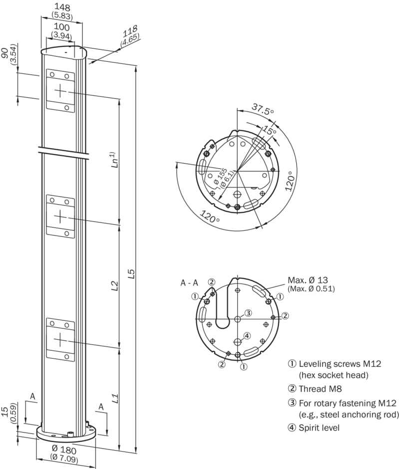 réflecteurs et optique, miroir, PM3S13-00430040, Modèle: Colonnes à miroirs avec miroirs individuels réglables, Description: PM3S mirror column with adjustable separate mirrors for beam deflection. Allows multi-sided access protection., Hau