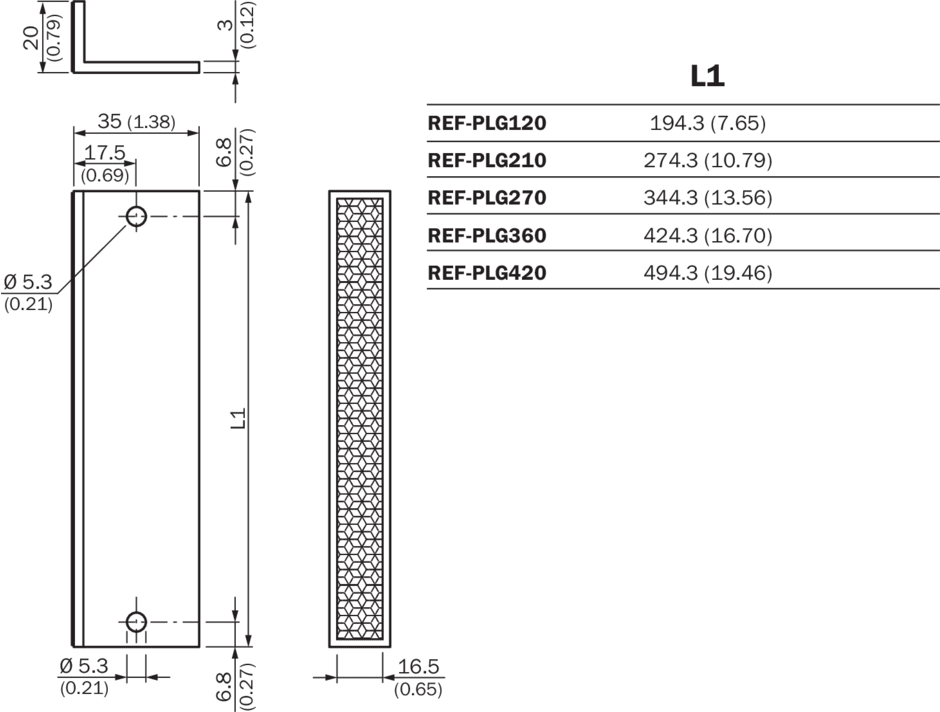 réflecteurs et optique, réflecteurs, REF-PLG420, Description: Film rétroréfléchissant sur profilé aluminium, 16,5 mm x 494,3 mm, fixation 2 trous, Température de fonctionnement: –25 °C ... +65 °C