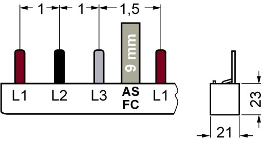 peigne à broches triphasé+interrupteur auxiliaire, longueur 1 016mm protégé contre les contacts directs, 18mm2 sans embouts, selon UL 508