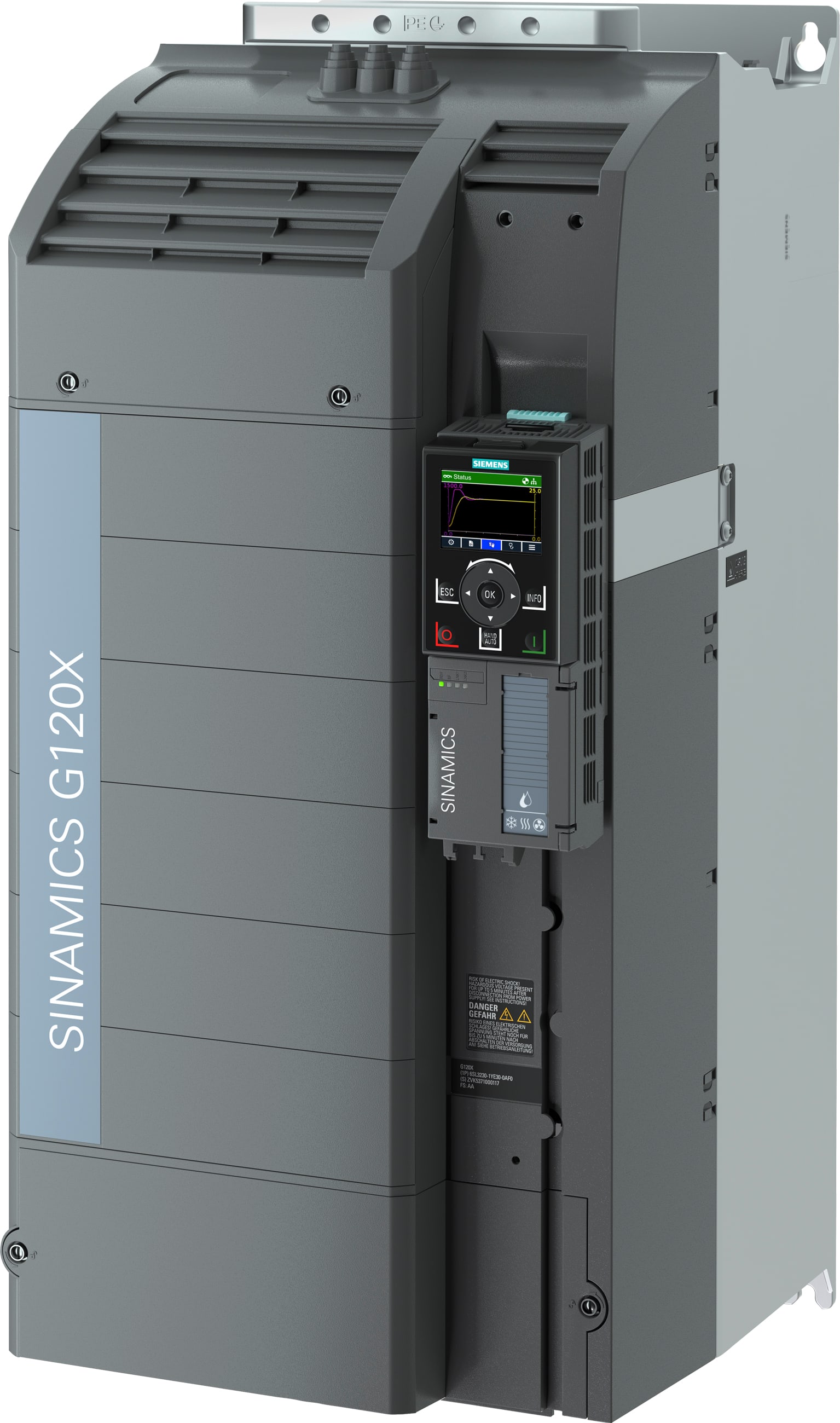 SINAMICS G120X puissance assignée : 110kW à 110% 60S, 100 % 240s filtre d'antiparasitage pour catégorie C2 3AC380-480V+10/-20% 47-63Hz Température ambiante -20 à +45°C Taille : FSF Indice de protection IP20 / UL open type Peinture 3C2 avec