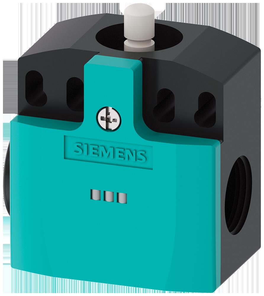 Interrupteur de position Boîtier plastique, 50 mm selon EN 50047 Raccordement d'appareil 2 x (M20 x 1,5) contacts à action brusque 1 NO / 2 NF LED, jaune/verte, 24V CC Poussoir en Téflon