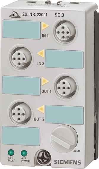 Module compact K45 AS-i TOR 2DI/2DQ, IP67 2 x entrées, 200 mA max. 2 x sorties, 2 A 24V CC 3 A max. pour toutes les sorties 4 x connecteurs femelle M12 Plaque de montage 3RK1901-2EA00 ou 3RK1901-2DA00 à commander séparément