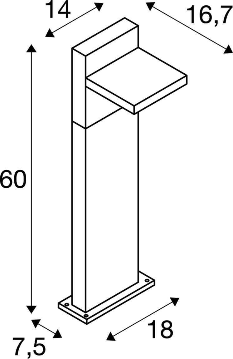 Extérieur lampadaires avec corps lumineux LED fixe. Matériau principal: Aluminium, Couleur: anthracite, Form: rectangulaire, Puissance assignée: 12 W, Flux lumineux assigné: 950 / 980 lm, Température de couleur (CCT): 3000/4000K, Indice général de rendu des couleurs (IRC) Ra: 80, Maintien du flux lumineux: L70B50 ≥ 30000 h, Classe de protection (EN 61140): I, Indice de protection (DIN EN 60529): IP55, donc Protection contre les interférences dues aux dépôts de poussière et Protection contre les jets d'eau provenant de toutes directions, Degré de résistance aux chocs selon IEC 62262: IK03, Tension d'alimentation: 100-240V ~50/60 Hz, Dimension (L/W/H): ( 18.7 / 18 / 60 cm ), Poids: 2.717 kg. Le produit répond aux exigences essentielles des directives européennes applicables et de la loi sur la sécurité des produits et porte le marquage CE.SLV Référence 1002991 / EAN 4024163231824