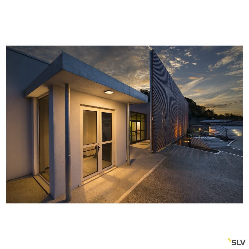 SLV AINOS - Solution d’éclairage à installer en saillie, robuste, résistante aux intempéries, au choix avec ou sans capteur. Applique et plafonnier, rond ou carré, en aluminium, utilisable en extérieur grâce à son indice de protection IP44. Luminaire équipé d'un détecteur de mouvement invisible intégré, à technologie micro-ondes. La durée d'éclairage, l'intensité et la sensibilité de détection peuvent être réglées individuellement par l'utilisateur lors de l'installation. La surface lumineuse dépolie qui dissimule une LED 18W est maintenue par le boîtier laqué. Le raccordement électrique du luminaire disponible en plusieurs coloris, s'effectue directement sur la tension secteur 230V car une alimentation LED est déjà intégrée.