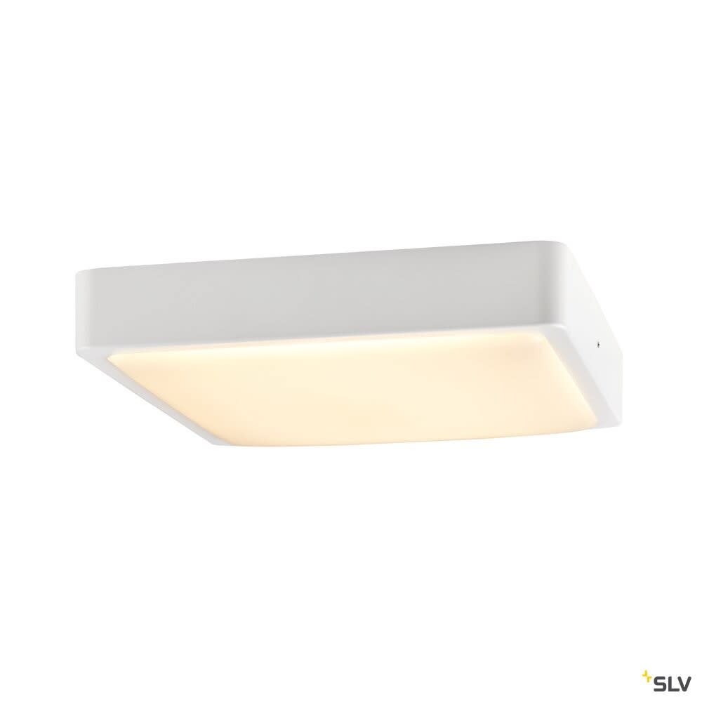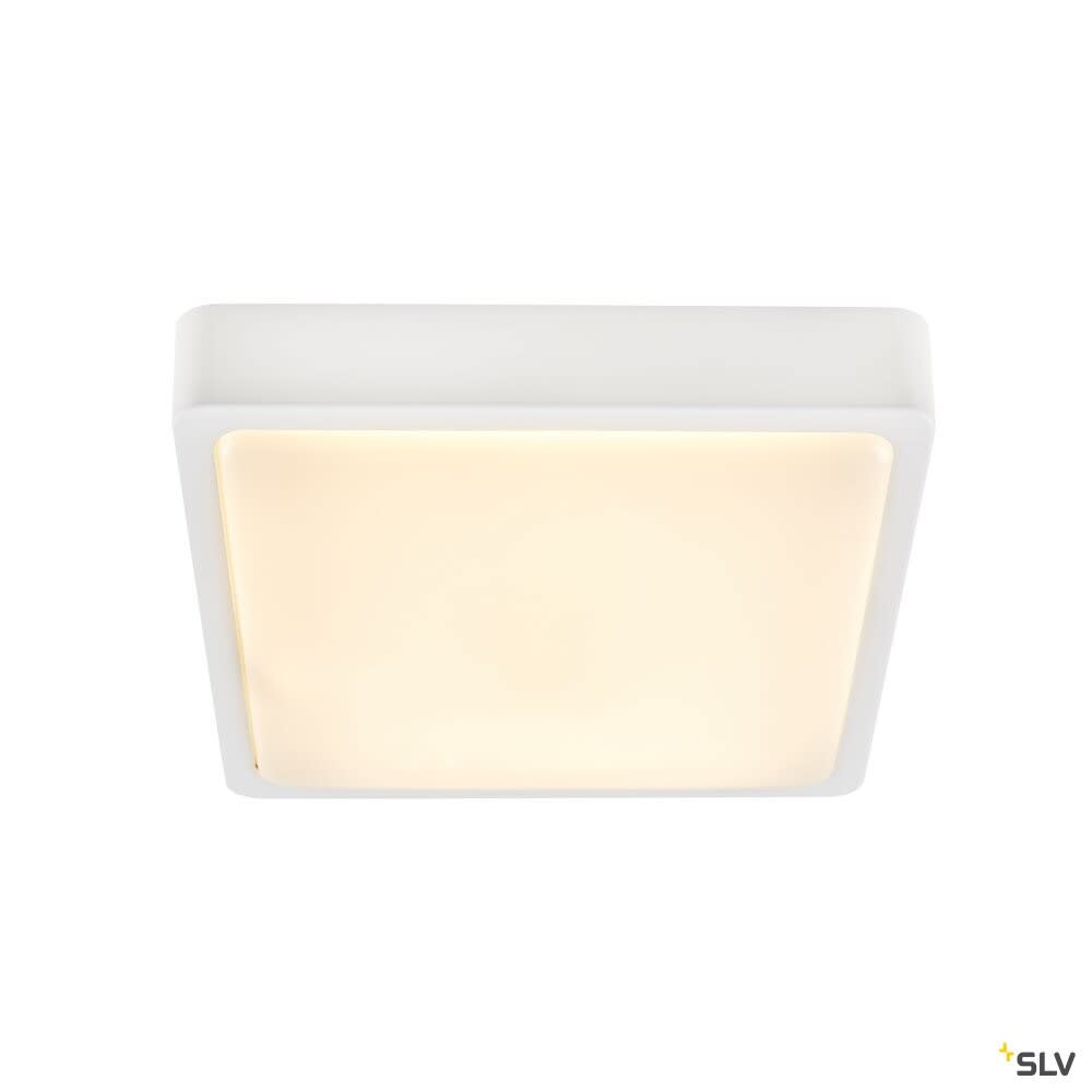 Extérieur applique murale ou de plafond avec corps lumineux LED fixe. Matériau principal: Aluminium et polycarbonate (PC), Couleur: blanc, Form: rectangulaire, Puissance assignée: 18 W, Flux lumineux assigné: 1300 lm, Température de couleur (CCT): 3000/4000K, Indice général de rendu des couleurs (IRC) Ra: 80, Maintien du flux lumineux: L70B50 ≥ 30000 h, Classe de protection (EN 61140): I, Indice de protection (DIN EN 60529): IP65, donc protection contre l'intrusion de poussière et protection contre les jets d'eau de toutes directions, Degré de résistance aux chocs selon IEC 62262: IK02, Tension d'alimentation: 220-240V ~50/60 Hz, Dimension (L/W/H): ( 30 / 30 / 6.5 cm ), Poids: 1.988 kg. Le produit répond aux exigences essentielles des directives européennes applicables et de la loi sur la sécurité des produits et porte le marquage CE.SLV Référence 1003451 / EAN 4024163236089