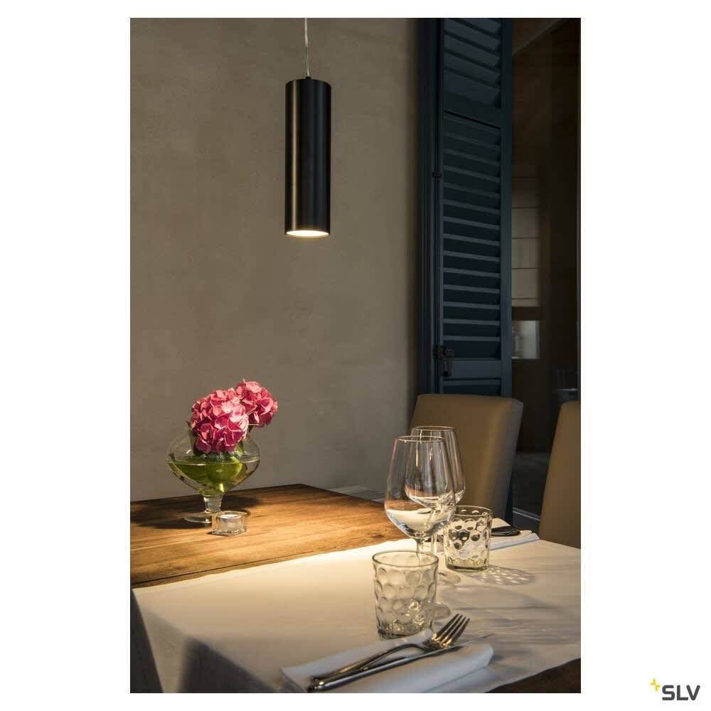 Intérieur suspensions avec corps lumineux LED fixe. Matériau principal: Aluminium, Couleur: noir, Dimmable: Variateur en fin de phase, Form: cylindrique, Puissance assignée: 10 W, Flux lumineux assigné: 240 / 820 lm, Température de couleur (CCT): 3000K, Indice général de rendu des couleurs (IRC) Ra: 90, Maintien du flux lumineux: L80B20 ≥ 50000 h, Classe de protection (EN 61140): I, Indice de protection (DIN EN 60529): IP20, donc Protection contre les corps étrangers solides ayant un diamètre > 12,5 mm, Tension d'alimentation: 220-240V ~50/60Hz sek. 500mA, Diamètre du luminaire: 8.4 cm, Diamètre du baldaquin: 7.5 cm, Dimension (L/W/H): ( 8.4 / 8.4 / 27 cm ), Poids: 1.003 kg. Le produit répond aux exigences essentielles des directives européennes applicables et de la loi sur la sécurité des produits et porte le marquage CE.SLV Référence 1000813 / EAN 4024163191050