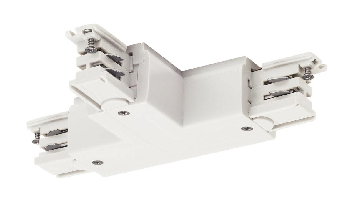 Connecteur T avec possibilité d'alimentation pour système de rail en saillie triphasé 230V. Le connecteur, disponible en plusieurs coloris, est proposé avec la terre gauche ou droite. Vous trouverez des informations plus détaillées dans le guide d'installation.
