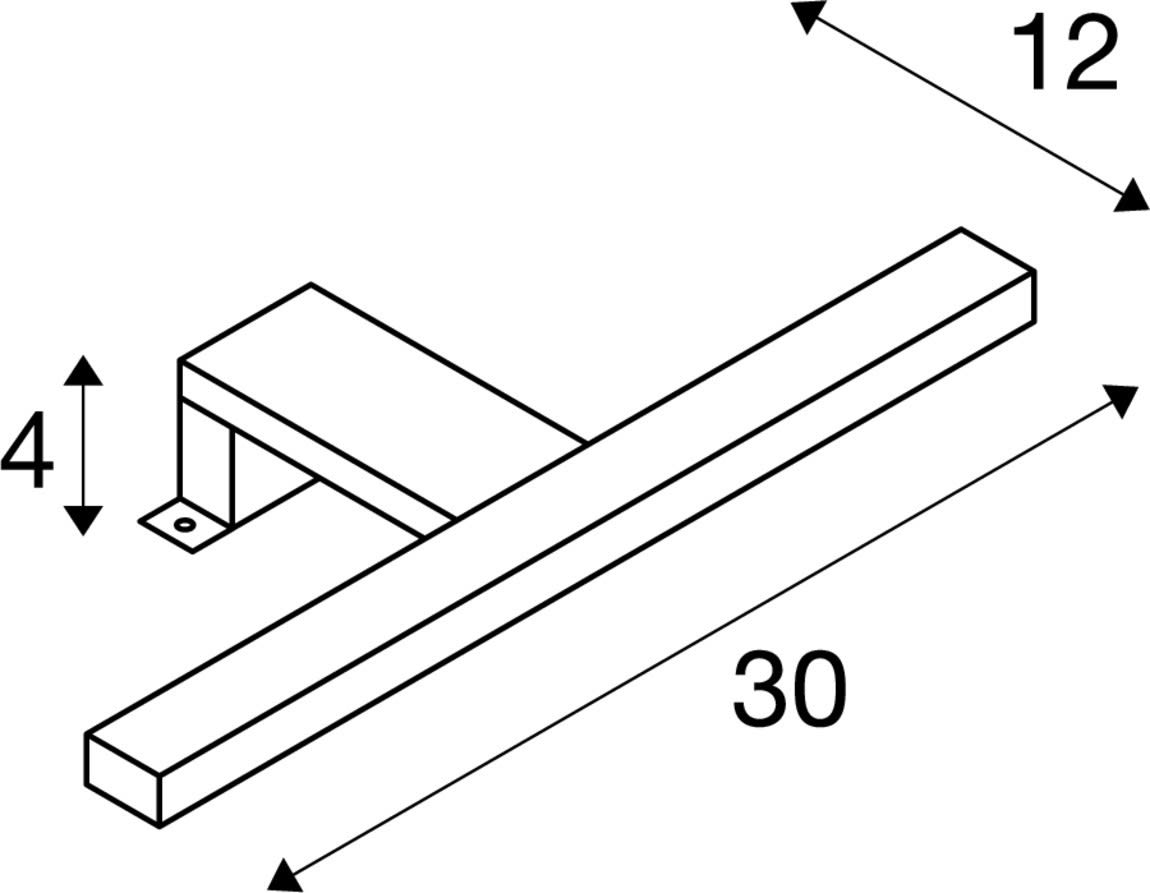 Intérieur appliques avec corps lumineux LED fixe. Matériau principal: Aluminium et plastique, Couleur: chrome, Form: rectangulaire, Puissance assignée: 5.2 W, Flux lumineux assigné: 300 lm, Température de couleur (CCT): 4000K, Indice général de rendu des couleurs (IRC) Ra: 80, Maintien du flux lumineux: L70B50 ≥ 30000 h, Classe de protection (EN 61140): II, Indice de protection (DIN EN 60529): IP44, donc protection contre les corps étrangers solides > 1mm et protection contre les projections d'eau de toutes directions, Tension d'alimentation: 200-240V ~50Hz sek. 340mA, Dimension (L/W/H): ( 30 / 12 / 4 cm ), Poids: 0.316 kg. Le produit répond aux exigences essentielles des directives européennes applicables et de la loi sur la sécurité des produits et porte le marquage CE.SLV Référence 1000777 / EAN 4024163190695