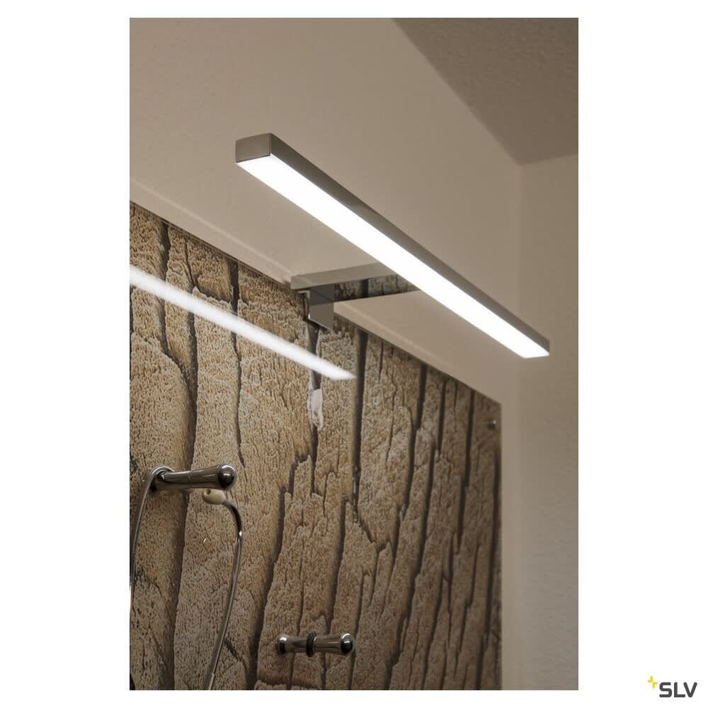 Intérieur appliques avec corps lumineux LED fixe. Matériau principal: Aluminium et plastique, Couleur: chrome, Form: rectangulaire, Puissance assignée: 6.6 W, Flux lumineux assigné: 370 lm, Température de couleur (CCT): 4000K, Indice général de rendu des couleurs (IRC) Ra: 80, Maintien du flux lumineux: L70B50 ≥ 30000 h, Classe de protection (EN 61140): II, Indice de protection (DIN EN 60529): IP44, donc protection contre les corps étrangers solides > 1mm et protection contre les projections d'eau de toutes directions, Tension d'alimentation: 200-240V ~50Hz sek. 340mA, Dimension (L/W/H): ( 50 / 12 / 4 cm ), Poids: 0.397 kg. Le produit répond aux exigences essentielles des directives européennes applicables et de la loi sur la sécurité des produits et porte le marquage CE.SLV Référence 1000780 / EAN 4024163190725