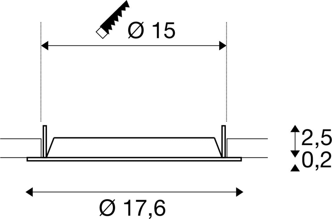 Plafonnier encastré. Matériau principal: polycarbonate (PC), Couleur: noir, Diamètre du luminaire: 17.6 cm, Diamètre de la découpe: 15 cm, Dimension (L/W/H): ( 17.6 / 17.6 / 2.5 cm ), Poids: 0.058 kg.SLV Référence 1007483 / EAN 4024163278386