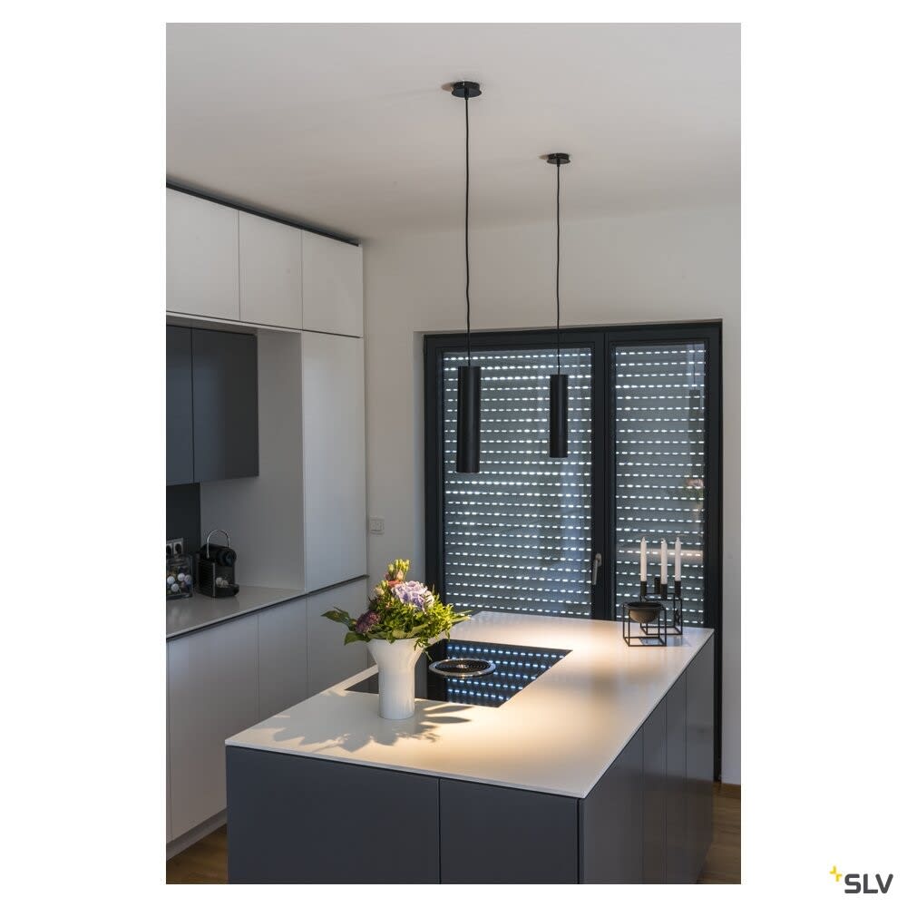 Intérieur suspensions. Matériau principal: Aluminium et Acier, Couleur: noir, Culot: GU10, Form: cylindrique, Puissance assignée: 50 W, Classe de protection (EN 61140): I, Indice de protection (DIN EN 60529): IP20, donc Protection contre les corps étrangers solides d'un diamètre > 12,5mm, Tension d'alimentation: 230V ~50Hz, Diamètre du luminaire: 6.7 cm, Dimension (L/W/H): ( 6.7 / 6.7 / 30 cm ), Poids: 0.719 kg. Le produit répond aux exigences essentielles des directives européennes applicables et de la loi sur la sécurité des produits et porte le marquage CE.SLV Référence 151850 / EAN 4024163149884