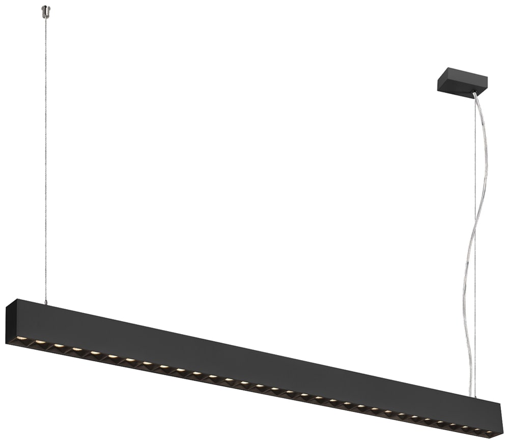 Intérieur suspensions avec corps lumineux LED fixe. Matériau principal: aluminium et Plastique PC, Couleur: noir, Dimmable: DALI,Touch, Form: rectangulaire, Puissance assignée: 60 W, Flux lumineux assigné: 6900 lm, Température de couleur (CCT): 3000K, Indice général de rendu des couleurs (IRC) Ra: 90, Maintien du flux lumineux: L80B10 ≥ 50000 h, Classe de protection (EN 61140): I, Indice de protection (DIN EN 60529): IP20, Degré de résistance aux chocs selon IEC 62262: IK02, Tension d'alimentation: 220-240V ~0/50/60 Hz, Dimension (L/W/H): ( 128.5 / 4.8 / 7.6 cm ), Poids: 3.5 kg. Le produit répond aux exigences essentielles des directives européennes applicables et de la loi sur la sécurité des produits et porte le marquage CE.SLV Référence 1010510 / EAN 4024163315142