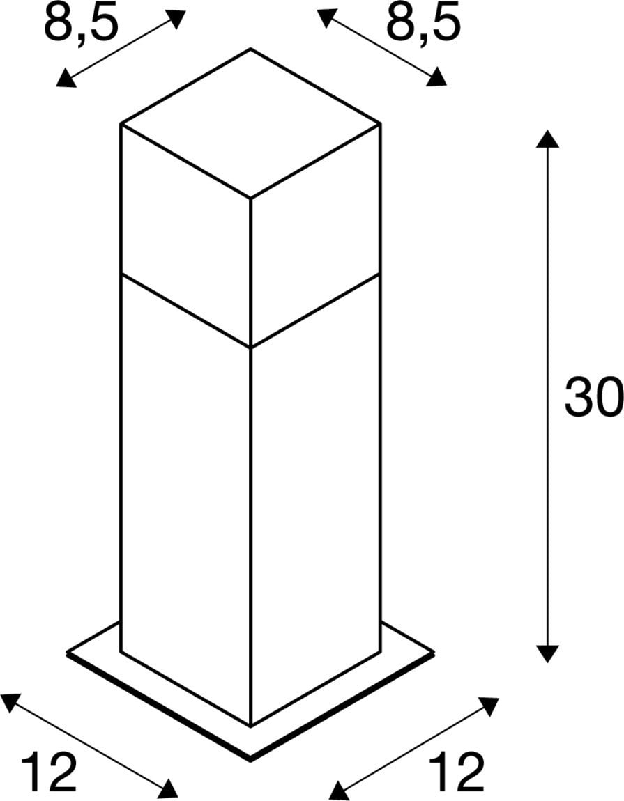 Extérieur lampadaires. Matériau principal: Aluminium et plastique, Couleur: anthracite, Culot: E27, Form: rectangulaire, Puissance assignée: 11 W, Classe de protection (EN 61140): I, Indice de protection (DIN EN 60529): IP44, donc protection contre les corps étrangers solides > 1mm et protection contre les projections d'eau de toutes directions, Tension d'alimentation: 230V ~50Hz, Dimension (L/W/H): ( 8.5 / 8.5 / 30 cm ), Poids: 0.811 kg. Le produit répond aux exigences essentielles des directives européennes applicables et de la loi sur la sécurité des produits et porte le marquage CE.SLV Référence 231215 / EAN 4024163097611