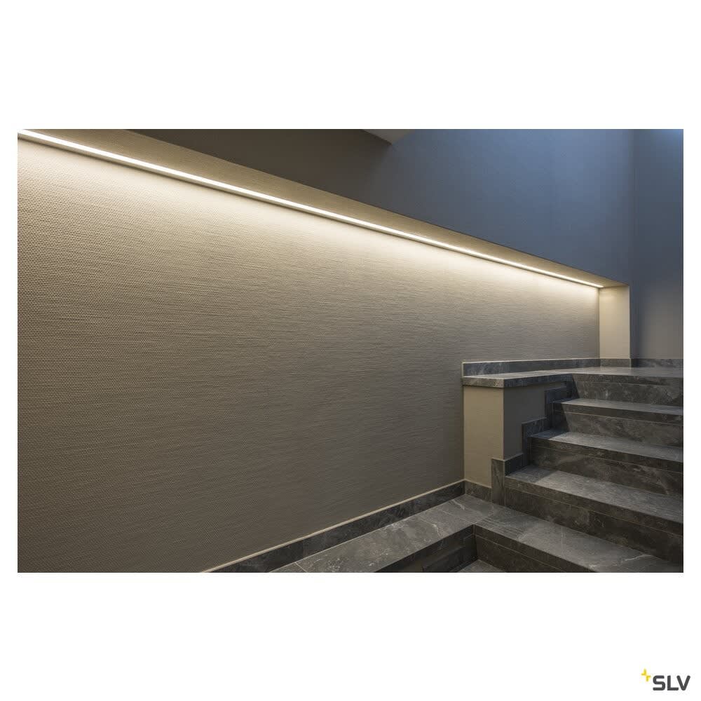 Profil GRAZIA 10 de grande taille, en aluminium, à encastrer au plafond ou au mur, pour la pose de bandeaux LED. Les caches en plastique satiné disponibles séparément fournissent une lumière très douce. Profil disponible en trois couleurs et longueurs. SLV recommande l'utilisation d'embouts (vendus séparément) pour la fixation du profil.