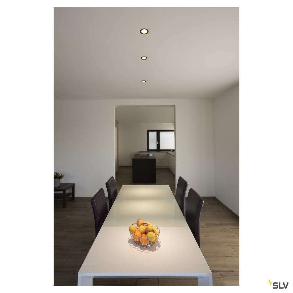 Intérieur plafonnier encastré avec corps lumineux LED fixe. Matériau principal: Aluminium et polycarbonate (PC), Couleur: noir et or, Form: rond, Puissance assignée: 9 W, Flux lumineux assigné: 570 lm, Température de couleur (CCT): 3000K, Indice général de rendu des couleurs (IRC) Ra: 80, Maintien du flux lumineux: L70B50 ≥ 30000 h, Classe de protection (EN 61140): III, Indice de protection (DIN EN 60529): IP20, donc Protection contre les corps étrangers solides d'un diamètre > 12,5 mm, Tension d'alimentation: 500mA, Diamètre du luminaire: 7.8 cm, Diamètre de la découpe: 6.8 cm, Dimension (L/W/H): ( 7.8 / 7.8 / 8.2 cm ), Poids: 0.185 kg. Le produit répond aux exigences essentielles des directives européennes applicables et de la loi sur la sécurité des produits et porte le marquage CE.SLV Référence 1002594 / EAN 4024163228190