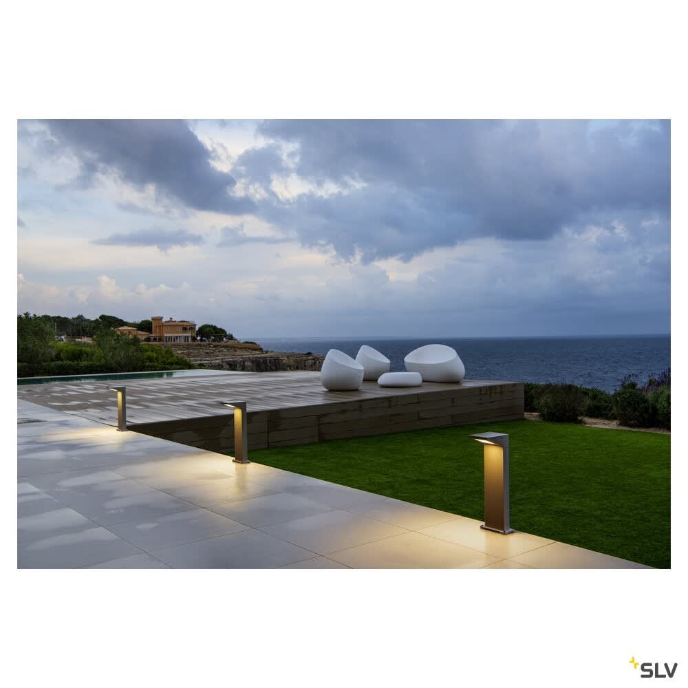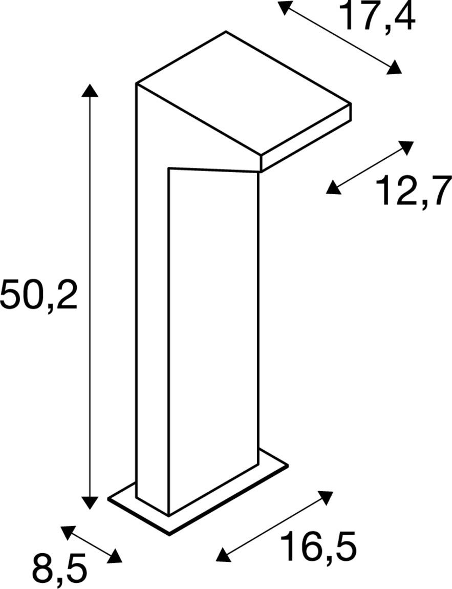 Extérieur lampadaires avec corps lumineux LED fixe. Matériau principal: Aluminium et plastique, Couleur: anthracite, Form: rectangulaire, Puissance assignée: 4.5 W, Flux lumineux assigné: 400 lm, Température de couleur (CCT): 4000K, Indice général de rendu des couleurs (IRC) Ra: 80, Maintien du flux lumineux: L70B50 ≥ 25000 h, Classe de protection (EN 61140): II, Indice de protection (DIN EN 60529): IP44, donc protection contre les corps étrangers solides > 1mm et protection contre les projections d'eau de toutes directions, Degré de résistance aux chocs selon IEC 62262: IK02, Tension d'alimentation: 230V ~50Hz, Dimension (L/W/H): ( 12.7 / 17.4 / 50.2 cm ), Poids: 1.585 kg. Le produit répond aux exigences essentielles des directives européennes applicables et de la loi sur la sécurité des produits et porte le marquage CE.SLV Référence 231305 / EAN 4024163126861